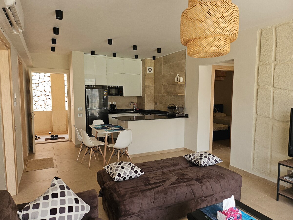 A Stylish 3BR Retreat Just 60 Minutes from New Cairo. Effortless Water Access: Enjoy easy, direct access to both the crystal-clear lagoon and the pristine beach. Spacious Comfort: 3 Bedrooms (including a private Master Suite) and 2 clean, modern bathrooms. Fully Equipped for Living: An open-concept kitchen with all modern appliances, plus a dedicated dining area and a cozy living room. Modern Essentials: Stay cool and connected with full Air Conditioning, High-Speed Internet, and TV.