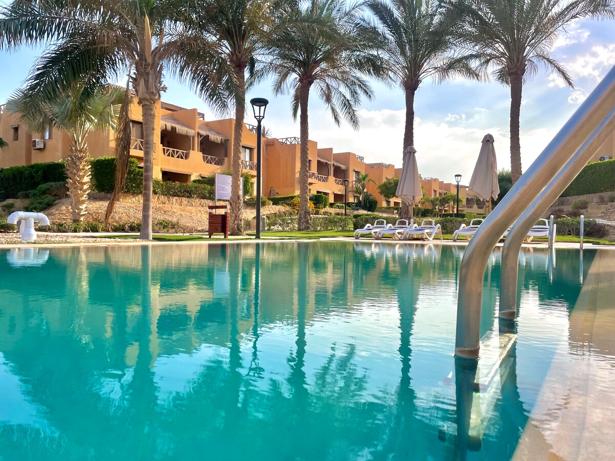 Unwind in style at this charming 2-bedroom getaway nestled within the exclusive La Siesta compound. This private villa boasts a lush garden and a heated jacuzzi overlooking the stunning Gulf of Suez, framed by the Galala Mountains. Step into comfort with 5 beds and a sofa bed, two ensuite bathrooms, and a sunlit living space designed for relaxation. Whether you're soaking in the jacuzzi, enjoying breakfast in the garden, or watching the sunset from the beach, every moment here is unforgettable.
