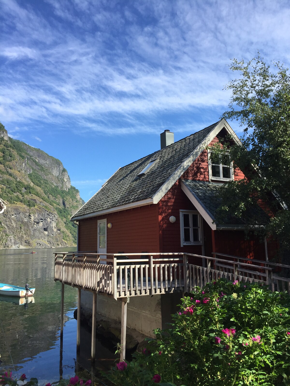 Kabin Flåm stansiyası/limanından piyada 5 dəqiqəlik məsafədə, su kənarında gözəl şəkildə yerləşən 4 öz-özünə yemək, 3 yataq otağı kabinəsi/rorbuerdən biridir. Panoramalı mənzərələri olan Flåm-də ən yaxşı mövqe. Təəssüf ki, qışda deyil, kiçik ştepselli gəminin istifadəsi qiymətə daxil edilir. Wi-Fi, peyk TV, Bluetooth səsucaldan, odun yandıran, qabyuyan maşın, paltar yuma maşını, mikrodalğalı soba və tam təchiz olunmuş mətbəx. Pulsuz şəxsi parkinq. Avstraliya/Norveç ev sahibləri.