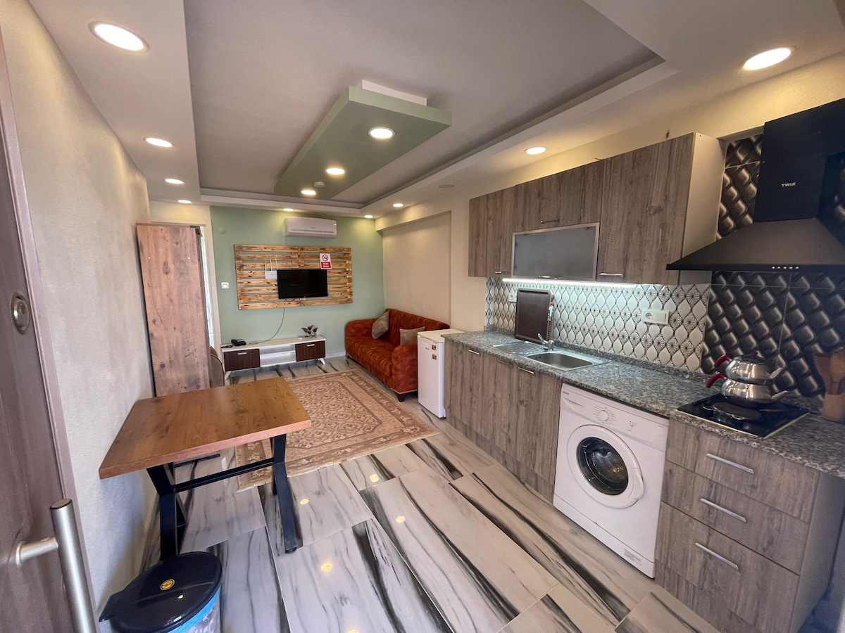 Kuşadada ən gözəl çimərlik olan qadın çimərliyindən 100 metr məsafədə yerləşir. Migros və baqqal mağazaları 50 metr məsafədə mövcuddur. Çimərliyə üzmə məsafəsi. Şəhər mərkəzinə 5 dəqiqəlik yoldur. Efes və meryemana və ya 15 sağ avtomobil. Otaqlarımız studiya mənzili şəklindədir və 4 və ya 5 nəfər asanlıqla qala bilər.