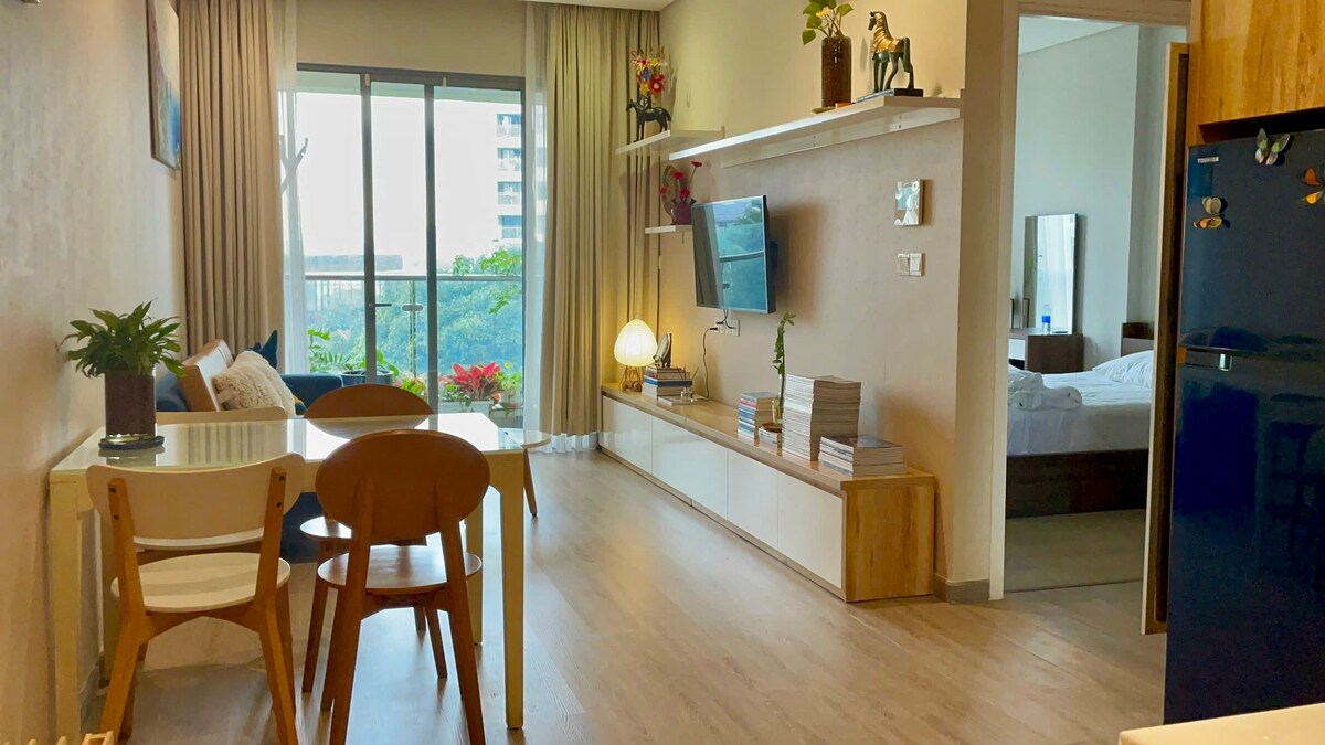 A stylish & comfortable apartment with balcony 85m2 at Hung Phuc Happy Residence located in the heart of district 7, Phu My Hung, with just a short walk to stores, mall, restaurants, and conveniences. Nearest bus stop in front. Highly educated and quite neighbors that surrounded by green parks and beautiful villas. Decorated in modern Japandi x Wabi sabi style with a focus on natural materials & clean lines. A great getaway or even staycation for those who want to experience new things.