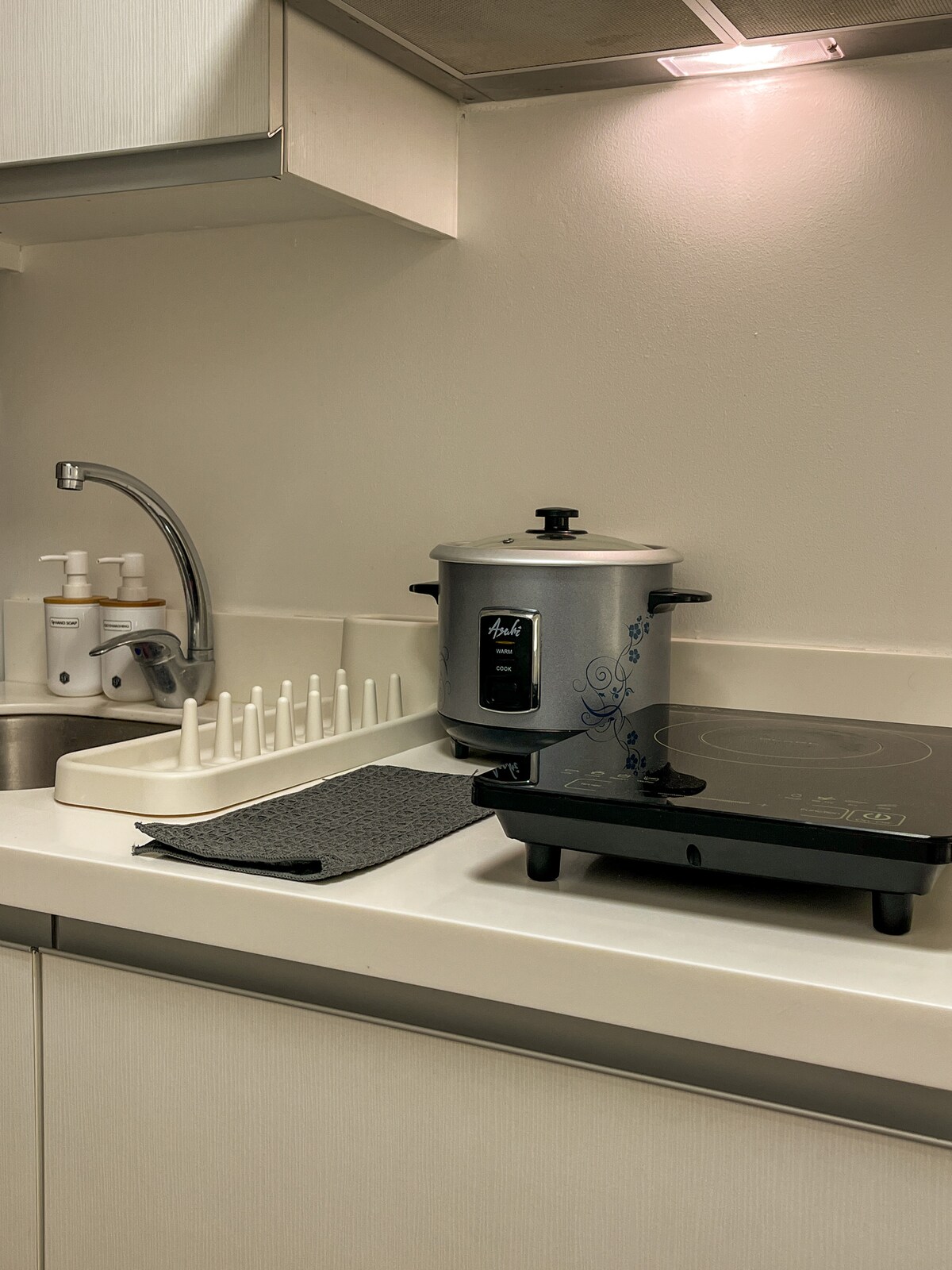 This 69 sqm (742 sqft) studio with 4 sqm balcony has: A large King Size bed in the main large room. Queen bed in the extra room. There is an aircon in the extra room but no window . Fast fiber Internet with 200+ Mbit/s. 55 inch smart TV with soundbar, Netflix and HD cable channels. A kitchenette with Refrigerator, Freezer, Induction hob, Microwave, Rice cooker, Kettle, Kitchen utensils and Cutlery. Coffee brewer & blender on request. Suite I1 is on the first floor. We have NO elevator.