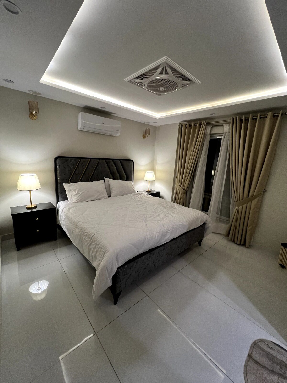 Best place for families travelling to Lahore. Gated society with high security for safety of residents. Only Families allowed. Many restaurants are nearby, McDonald's is also near. Top bakeries Tahzeeb Jalal Son, Cakes and Bakes are at 5 minute distance. Horse Riding club and 3 parks at walking distance. Hospital nearby Important "US$ 7 shall be charged for AC per room per night.** AC charges are not included in the rent. For long Stay actual meter reading will be charged @65 PKR per unit.