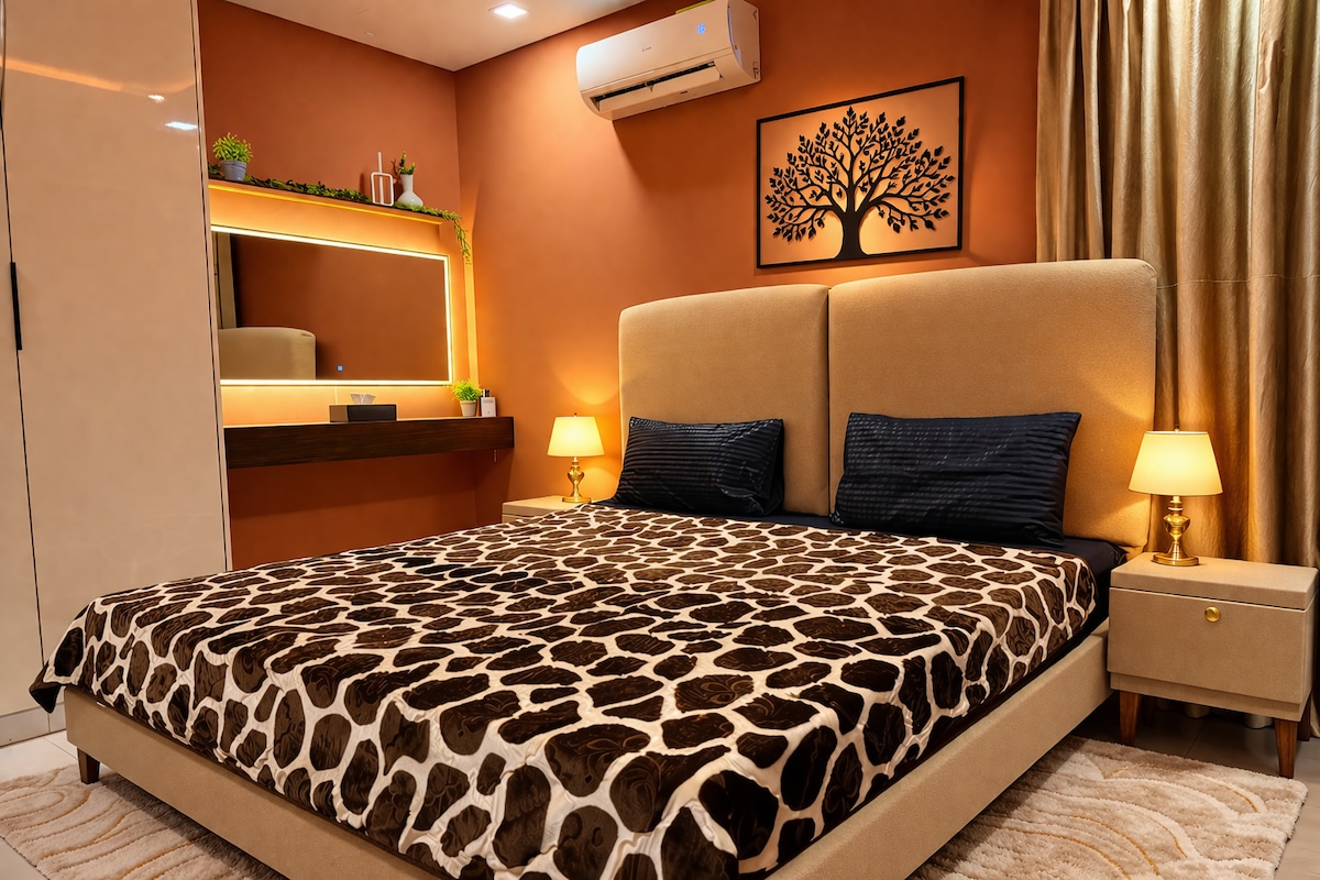 🖤 Lahorun Zameen Opal şəhərində Arkyn A Private Dark Retreat. Əhval-ruhiyyəli tünd dekor, təmtəraqlı çarpayı, ağıllı televizor və yüksək sürətli Wi-Fi ilə lüks 1BHK. Tam təchiz olunmuş mətbəxdən, rahat salondan, təhlükəsiz parkinqdən və 24/7 təhlükəsizlikdən zövq alın. Cəmi məxfilik üçün 🔐 öz-özünə giriş. Cütlüklər, tək səyahətçilər və ya kafe, alış-veriş və əsas yollara yaxın işgüzar səfərlər üçün mükəmməldir. Qəşəng, rahat tətiliniz sizi gözləyir.