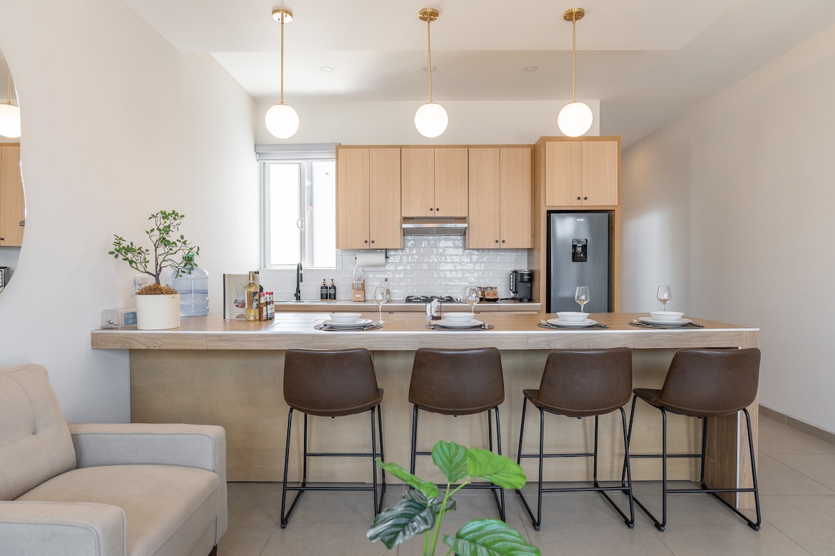 This 100 sq mts apartment is designed with high-end finishes and decoration. This is a spacious unit with high-ceilings and contemporary touches. It features a fully equipped kitchen and both bathrooms have perfectly pressurized hot showers. The two bedrooms include 60" TVs with signed-on Netflix with 125-meg Wi-Fi. The apartment is located inside the Casas Sanblu complex, which has 6 total units that share a private gated parking that fits 8 cars. We provide invoice for corporate customers!