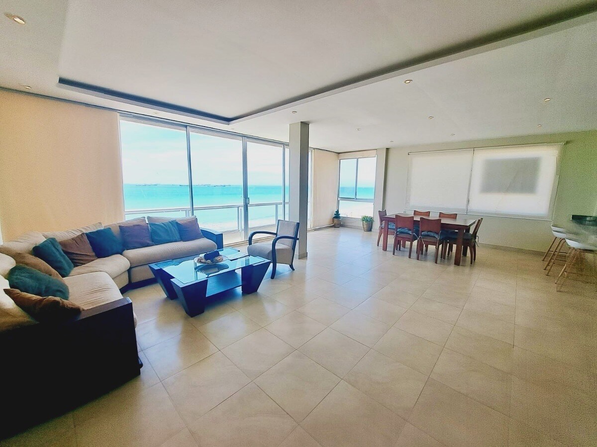 🌊 CIMA BLANCA | Apto. en 6.º piso | CUMBRE BLANCA Beach Tower con vista 180° al mar. Espacio moderno con cocina equipada, WiFi, 3 AC, 2 TV, 2 baños con agua caliente y estilo tropical chic. 🏡 Piscina infinita 38m · Gym · BBQ & Fogata · Juegos infantiles. 🐾 Pet friendly (-10 kg, previa aprobación) 🔐 Seguridad 24/7 · Parqueo privado/visitantes. 🏖️ Ubicación estratégica en Punta Blanca, ideal para explorar playas cercanas. ✨ Escapada Relax: privacidad, brisa marina y confort frente al mar.