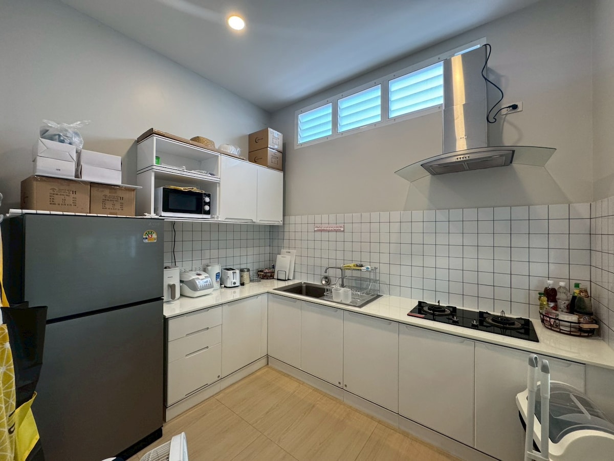 Spacious 4-bedroom villa perfect for groups & celebrations! Bedrooms: BR1 & BR2: King bed, en-suite bath BR3: 4 queen beds (2 bunk-style), en-suite BR4 (Rooftop): Queen bed + bathtub • Large party room with karaoke & shared bath • Private pool with dining terrace (10–12 guests) • 3–4 parking spaces Amenities: Smart TV, WiFi, karaoke system, gas stove, electric & charcoal BBQ grill, rice cooker, microwave, mortar & pestle, ice bucket, and full kitchen essentials.