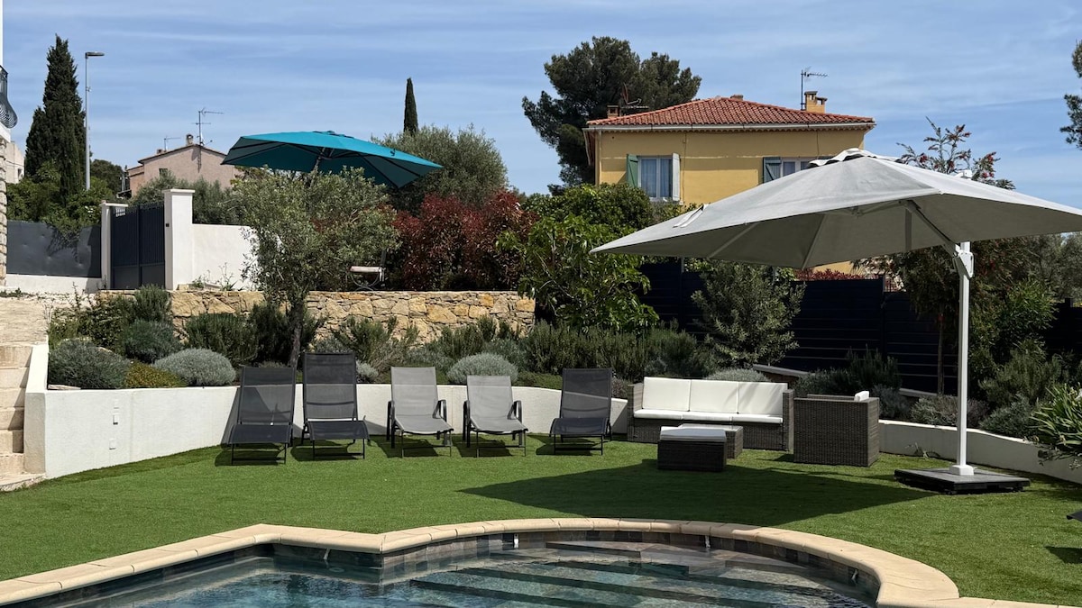 Nous louons les 120 m2 habitables du rez-de-chaussée de notre villa. La piscine chauffée, le jardin, le garage et les stationnements vous sont entièrement et uniquement réservés. Notre villa construite en 2022 est climatisée , et située à 100 m de la crique du Capellan et à 10 minutes à pieds de la plage Rènecros et du centre ville de Bandol. Proche toutes les commodités (supérette, vente poulets, pizzas, pharmacie ...) À 150 m des tennis et Padel .