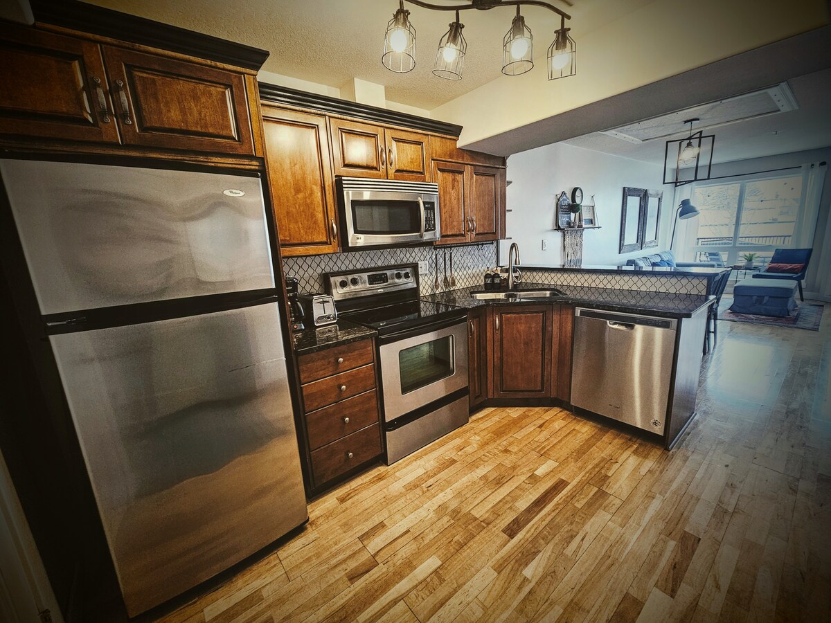 Kanmorun sakit və dəbli məkanına xoş gəlmisiniz! Bu dəbdəbəli kondominium şəhər mərkəzindən cəmi 10 dəqiqəlik piyada məsafədə yerləşir, mağazalar, restoranlar və gəzinti yolları qapınızın önündədir. Rahat daş buxarı ilə dincəlin, böyük ölçülü yataqda dərin yuxuya gedin və ya yüksək keyfiyyətli divan-çarpayıda əlavə qonaqları qəbul edin. İşıqlı, havadar yaşayış sahəsi, tam təchiz olunmuş mətbəx, otaqda camaşırxana, pulsuz parkinq və 1 GB yüksək sürətli Wi-Fi-dan zövq alın. Rok dağlarında macəra və ya istirahət üçün idealdır.
