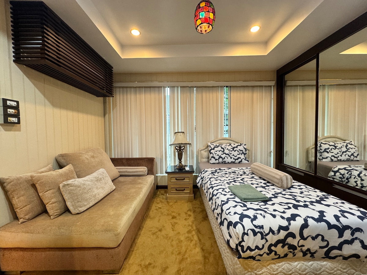 Spacious 2-bedroom apartment on the 4th floor, each with its own ensuite bathroom plus a cozy living room to relax in. Please note there is no elevator—stairs are required to access the unit. Perfect for families, friends, or business travelers seeking comfort and privacy near Suvarnabhumi airport(BKK)