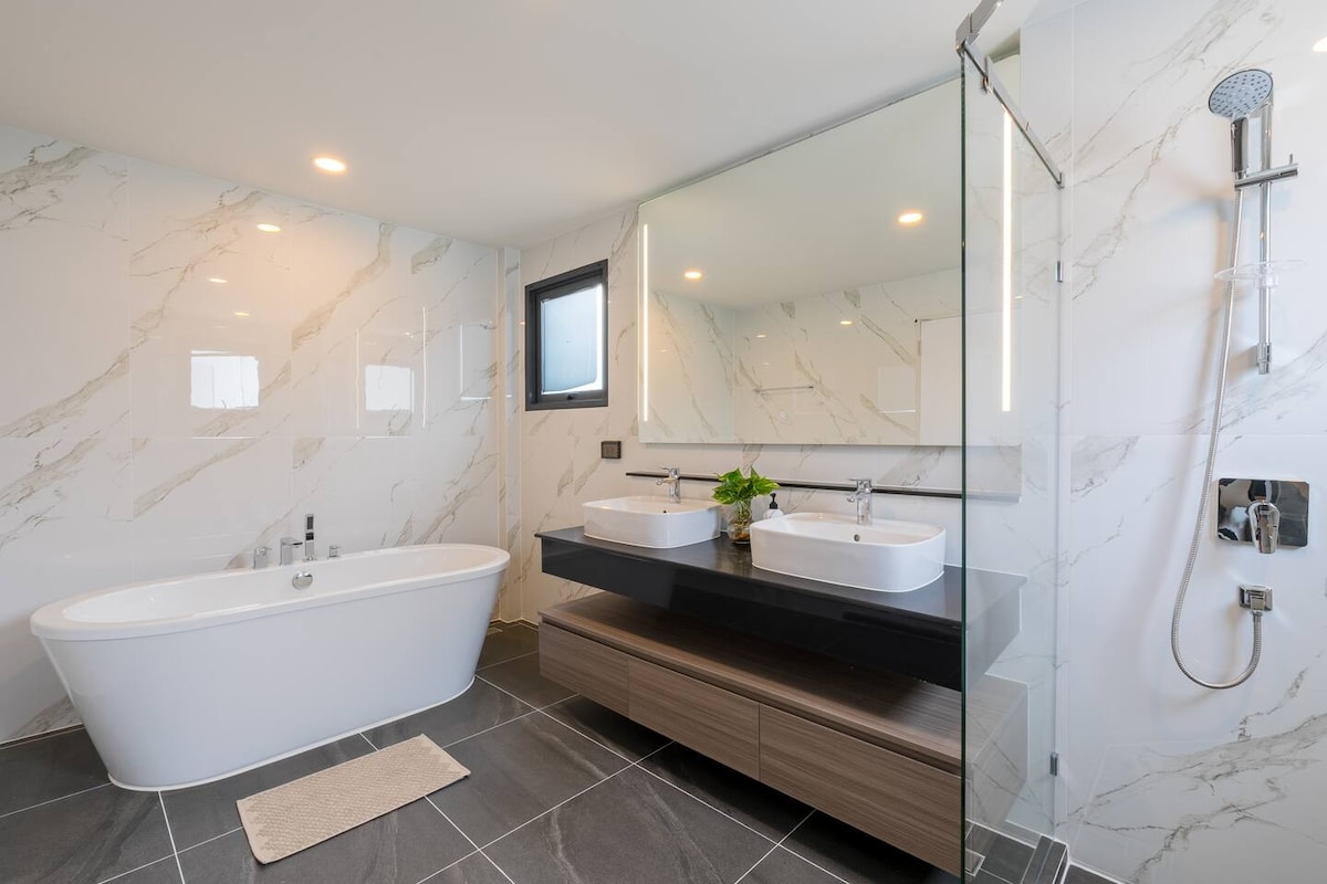 Forget cramped rooms—this expansive master suite gives you space to actually live. 75" entertainment center AND bathtub TV for next-level luxury. Large working desk for productivity, dual sinks, plus rain shower. Located near authentic markets, incredible street eats & stunning lakeside temples. Perfect for groups wanting space, couples needing a retreat, pet-friendly travelers. This isn't just accommodation—it's your Bangkok sanctuary. Go big or go home. Actually, go big AND feel at home.