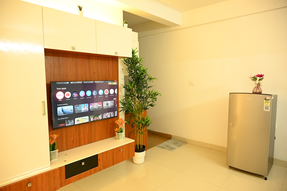 Bhartiya City, Leela Residence-də dəbli 1RK-nizə xoş gəlmisiniz! Tam təchiz olunmuş bu məkan tək səyahətçilər və ya cütlüklər üçün mükəmməldir. Rahat çarpayı, ağıllı televizor, balaca mətbəx, paltaryuyan maşın və yüksək sürətli Wi-Fi xidmətindən zövq alın. Mall, Multiplex, Park, Five Star Hotel, School, Hospital, Manyata Tech Park, hava limanı və şəhər vaciblərinə əla təhlükəsizlik və asan giriş imkanı olan premium şəhərcik icmasında yerləşir. Uzunmüddətli qonaqlamalar üçün idealdır.