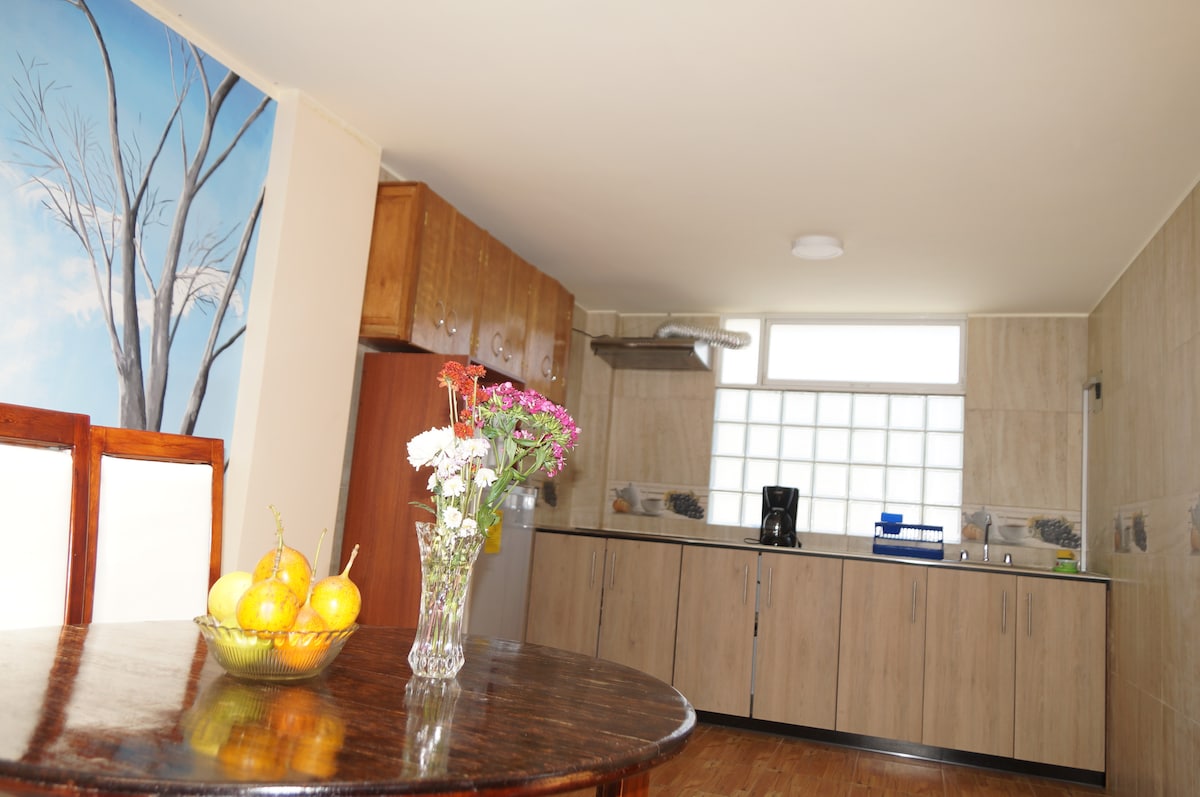 Əlinizdə şəxsi parkinqi, bağı, cakuzisi və terrası olan bu evdə bir ailə kimi dincəlin. Bañosun mərkəzindən 5 dəqiqəlik məsafədə yerləşirik. Burada bir fincan qəhvə və açıq cakuzimizdə isti üzməkdən zövq alaraq rahat qonaqlamadan zövq ala bilərsiniz. Qonaqlama yerinin daxilində və xaricində heç bir ödəniş etmədən istifadə etmək üçün dəsmallarımız var. Rəqəmsal köçərilər üçün ideal bir yerdir. Əsas yataq otağımızda masa və yüksək sürətli Wi-Fi var. Xoş gəlmişsiniz!