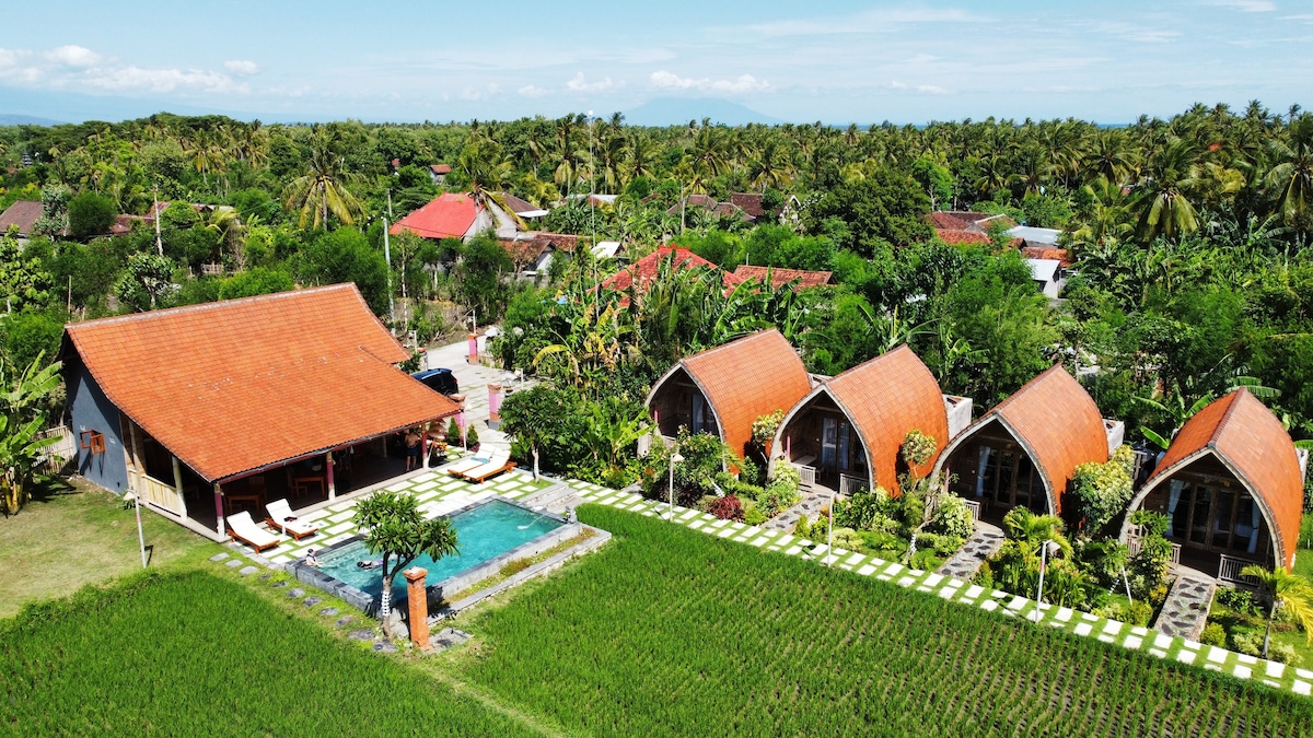 Ayrıca hovuz mənzərəsi olan, yamyaşıl bağlar və düyü sahələri ilə əhatə olunmuş tropik banqaloya dəbli dEscape-i sevəcəksiniz. Taxta qazxanada dincəlin, təravətləndirici üzgüçülükdən zövq alın və təbii dekorasiyası olan rustik, lakin rahat otaqda dincəlin. Sülh və təbiət axtaran cütlüklər və ya tək səyahətçilər üçün mükəmməldir. İjen Kraterə və digər təbii görməli yerlərə qısa məsafə qət edin. Yerli cazibədarlığı və müasir rahatlığı olan sakit məkan. Bu füsunkar qonaqlama yerinin dekorasiyası.