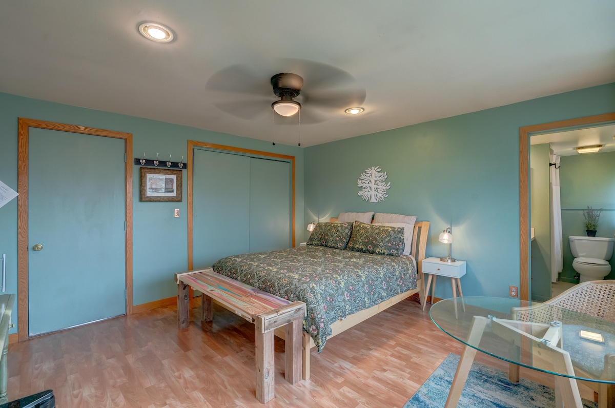 This architect-designed studio is bathed in natural light, with skylights and a breakfast nook with a wrap-around window. Featuring an upscale bathroom with a walk-in shower, this comfortable space has all the amenities perfect for a quick weekend getaway or a week-long business trip. The studio adjoins a house and is up a flight of stairs through a separate outdoor entrance. Located just up the hill—a 5-minute walk—to Downtown Middleton and a 15-minute drive to UW and Downtown Madison.