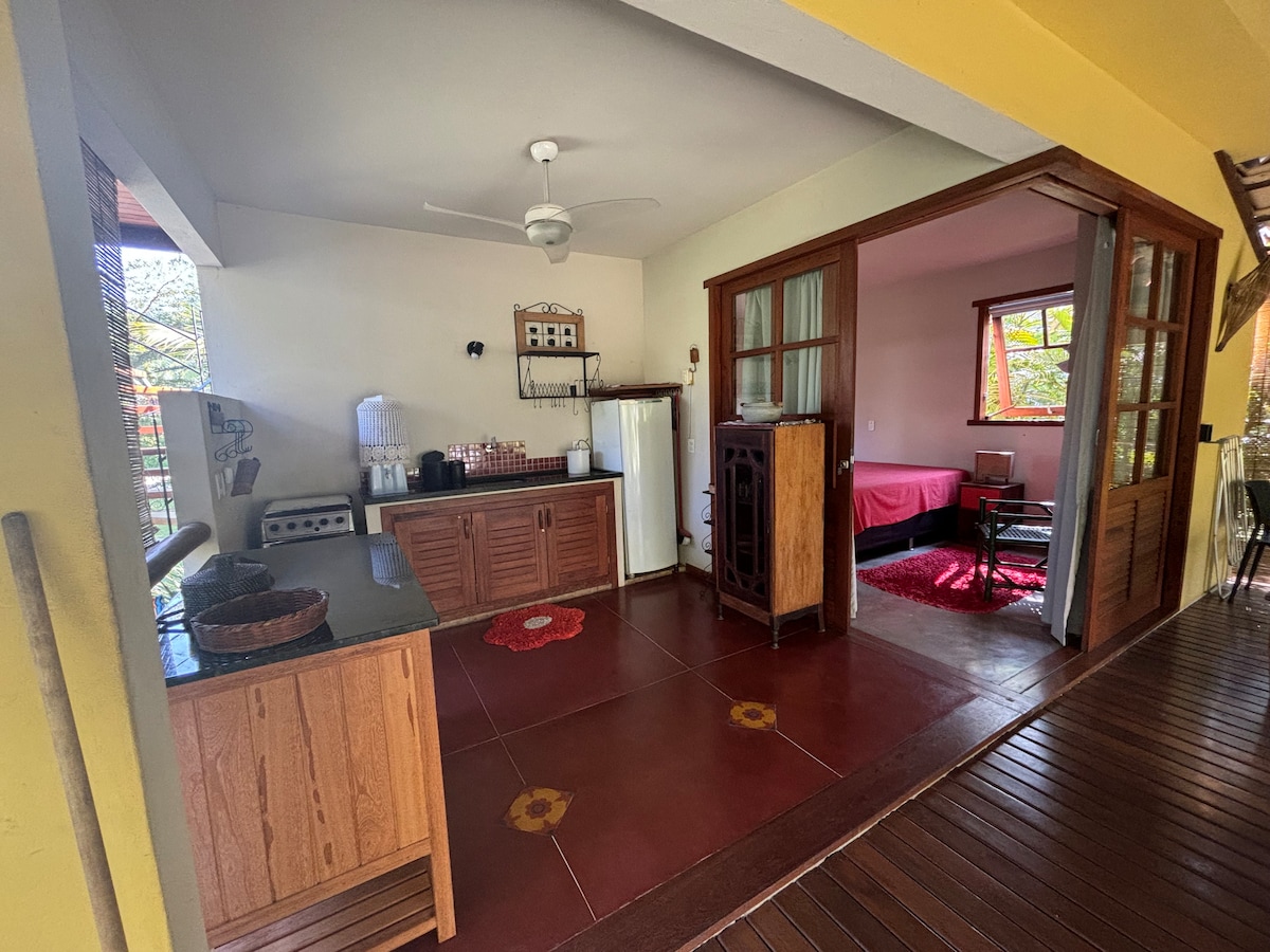 Təbiətin qoynunda rahatlıq və məxfilik. Bukolik mühiti sevən, lakin şəhərin rahatlığından imtina etməyən səyahətçilər üçün mükəmməldir. Banqaloda yemək hazırlamaq üçün bütün lazımi şəraiti olan mətbəx var. Açıq havada süita və duş. Torpaq parkinq sahəsi və portativ barbekü olan sahə ilə əhatə olunub. Taypu de Fora çimərliyindən 300 metr (piyada 5 dəqiqəlik məsafədə) və Təbii Hovuzlardan 1000 metr məsafədə yerləşirik.