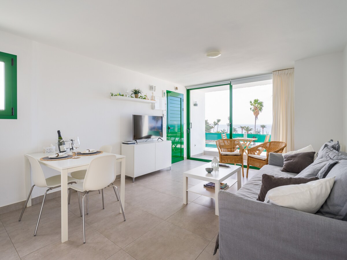 Apart. new, bright, overlooking the sea in one of the best areas of Puerto del Carmen. The terrace is great for breakfast or dinner watching the sea and pool. With all the amenities: Wiffi, air conditioning ,, safe, dishwasher, washing machine, fridge freezer, TV 50 ", kettle, coffee maker, utensils (pots, pans, dishes, cutlery, ...), pool Children + adults, playground, private parking. Bars, restaurants and large supermarket at 300 meters. Chica beach at 500 meters.