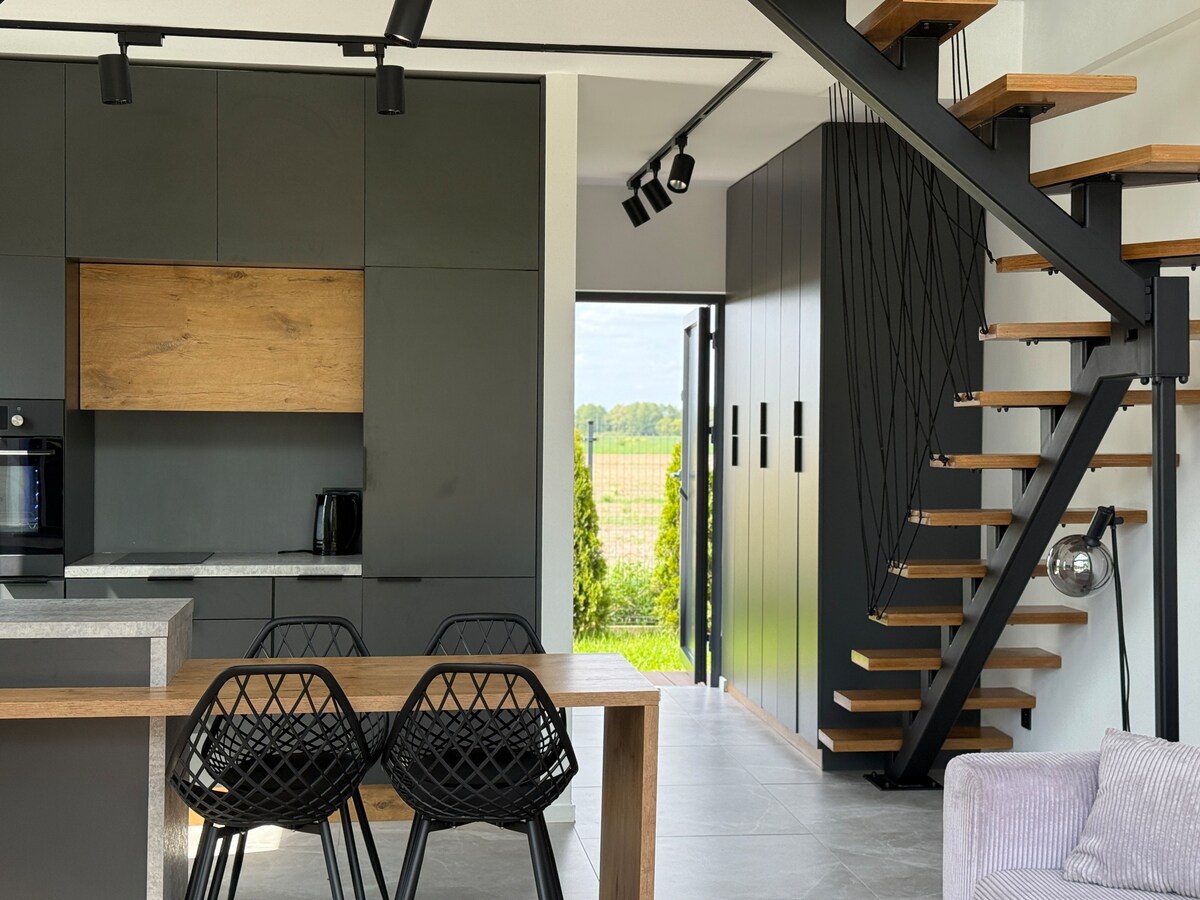 Built in 2024, this brand-new home offers a perfect blend of industrial style and cozy comfort. Just a 20-minute drive from Warsaw airport, it's ideally located for travellers seeking a peaceful retreat with convenient access to the city. It comfortably sleeps 4 guests. We live next door and are always happy to assist you during your stay.