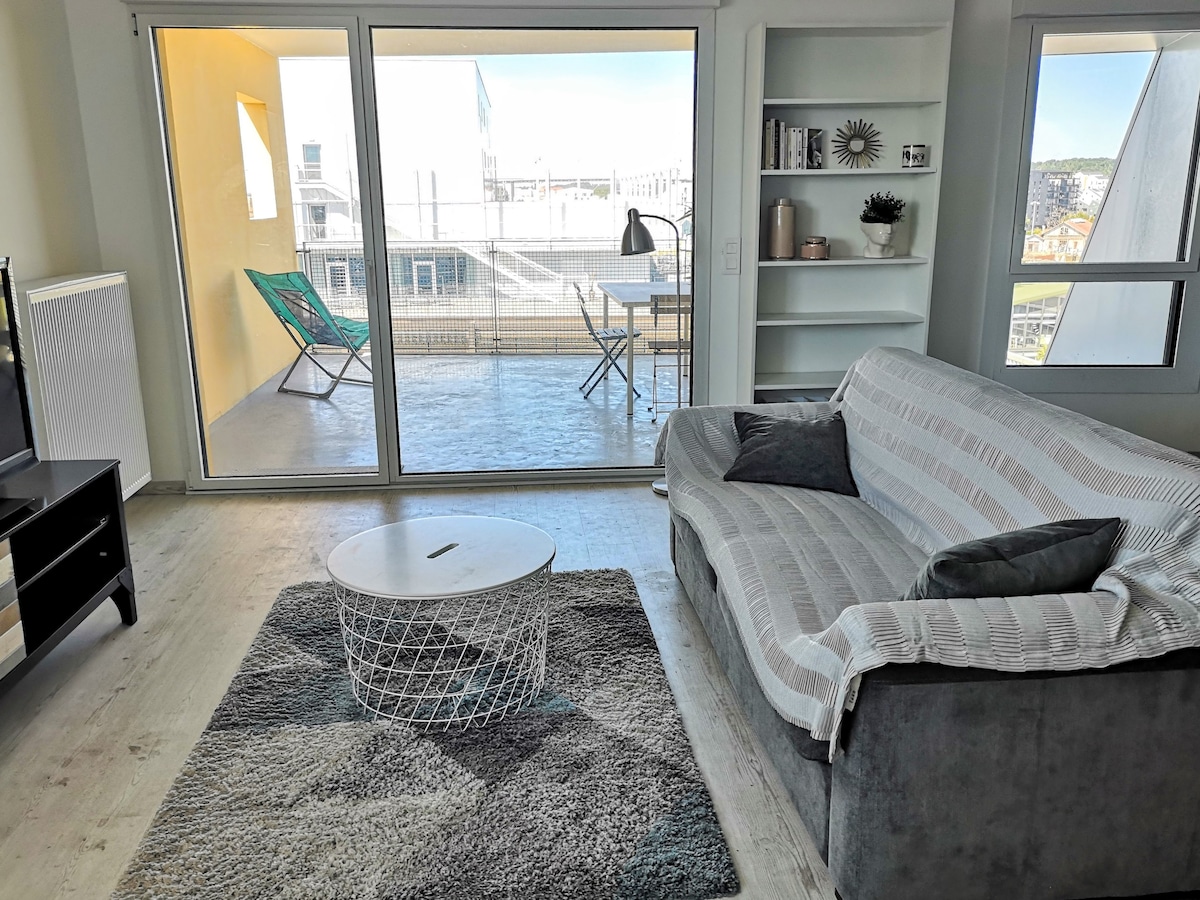 3 yataq otağı və terrası olan birinci mərtəbədə yerləşən mənzil. - Terrasa baxan böyük günəşli qonaq/yemək otağı (divan, qəhvə masası, televizor kabineti, böyük düz ekran, yemək masası); - Tam təchiz olunmuş Amerika mətbəxi: soyuducu, soba, mikrodalğalı soba, induksiya plitəsi, qabyuyan maşın, toster, Nespresso qəhvə maşını, çeşidli qablar və eynəklər. - Paltaryuyan maşınla camaşırxana - Master suite: ikinəfərlik çarpayı 160×200, yataq masaları, paltardəyişmə otağı, duşlu duş otağı. - 140×200 nəfərlik çarpayı və ona bitişik duş otağı olan emalatxana pəncərəsi ilə Hamam otağı və ona bitişik tualeti olan 2 nəfərlik çarpayı 90×200 olan otaq. İstəyə uyğun olaraq körpə stulu və çətir çarpayısı mövcuddur. Muzeylərdə bukletlər və broşürlər, Bordoya səfərlər yaşayış yerində sizin ixtiyarınızdadır. Bütün ev mövcuddur Çartrons rayonunda yerləşən mənzildə çox sayda mağaza (çörək, aptek, supermarket), eləcə də 15 dəqiqə ərzində şəhər mərkəzinə çatmaq üçün avtobus və tramvay var. Bordonu gəzməyin ən yaxşı yolu tramvaydır, sizi birbaşa Grand Théâtre şəhər mərkəzinə (4 dayanacaq) aparacaq. Vcub stansiyası (şəhər velosipedi icarəsi) mənzilə yaxındır. Bordo St Jean stansiyasından Tramvay dayanacağı Quinquonce dayanacağını götürün, tramvay B ( istiqamət Cité des vins, Berges de la garonne) stop Cours du Medoc. 5 dəqiqəlik gəzinti və təyinat nöqtəsinə çatdınız. Bordo Hava Limanı: Avtobus: Palais de Justice-də 1 xətt dayanacağı, 4 (St Louis istiqaməti) Gaussen və ya St döyüşündə dayanacağı seçin. 2 dəqiqəlik gəzinti və gəldiniz. İcarəyə döşəkağı və dəsmalların təmin edilməsi daxildir, qablar hazırlanmalı, zibil qutuları boşaldılmalı və istifadə olunan dəsmallar camaşır səbətində, eləcə də uçuşdan əvvəl döşəkağılarda olmalıdır.