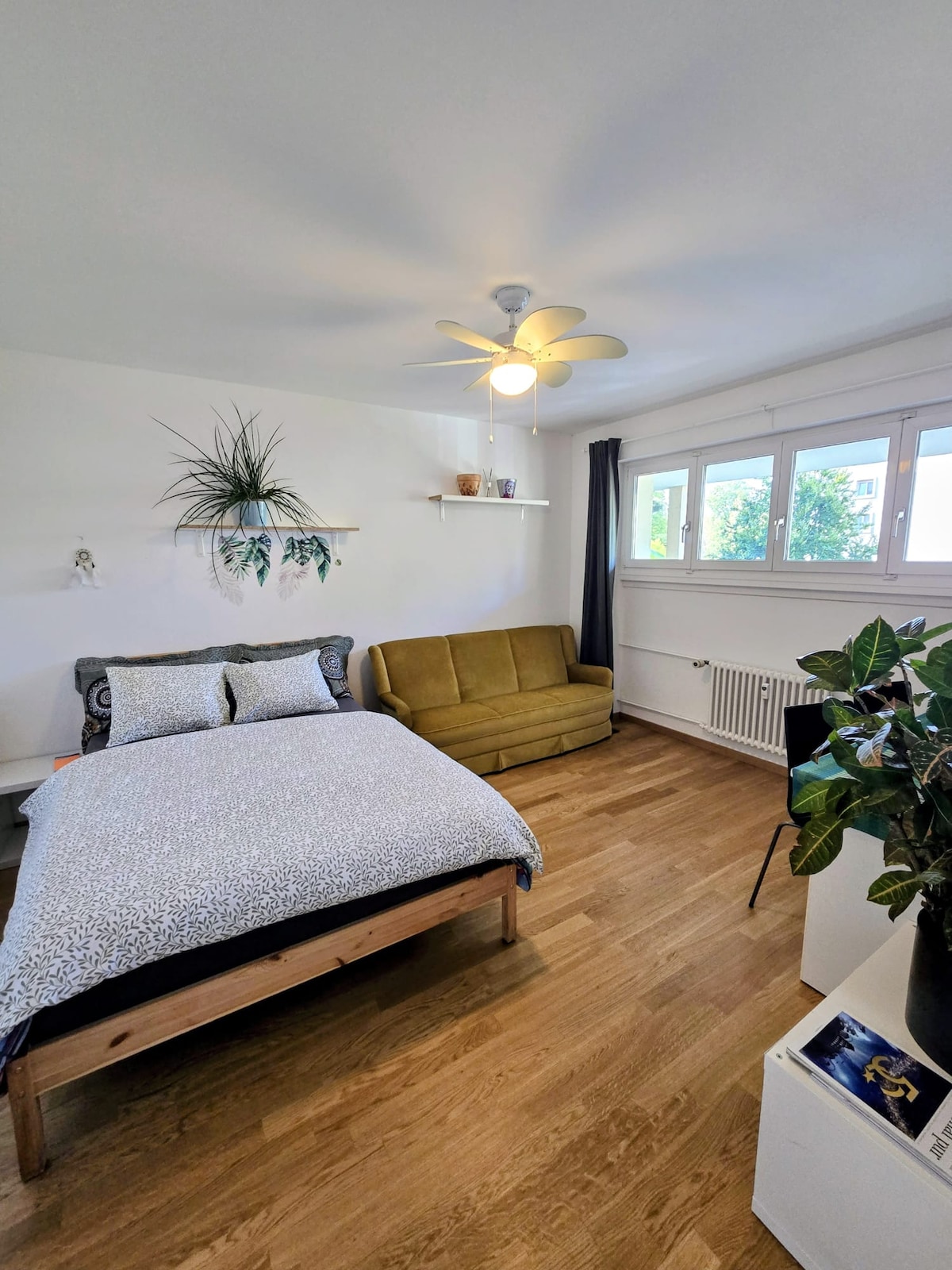 Welcome to the Matthäus Quartier! In the heart of Kleinbasel. Stylish 1-room apartment with NETFLIX in the city center near the trade fair, Rhine, Novartis, SBB train station, airport and bus stop "Erasmusplatz". 24h self-check-in. Free use of public transport in Basel thanks to the "BaselCard". 12min from train station via Bus, 11min from airport via cab. 30m2 apartment with double bed (160x200cm) and sofa bed. Fast WIFI, printer, coffee machine, kettle, toaster and much more is available.