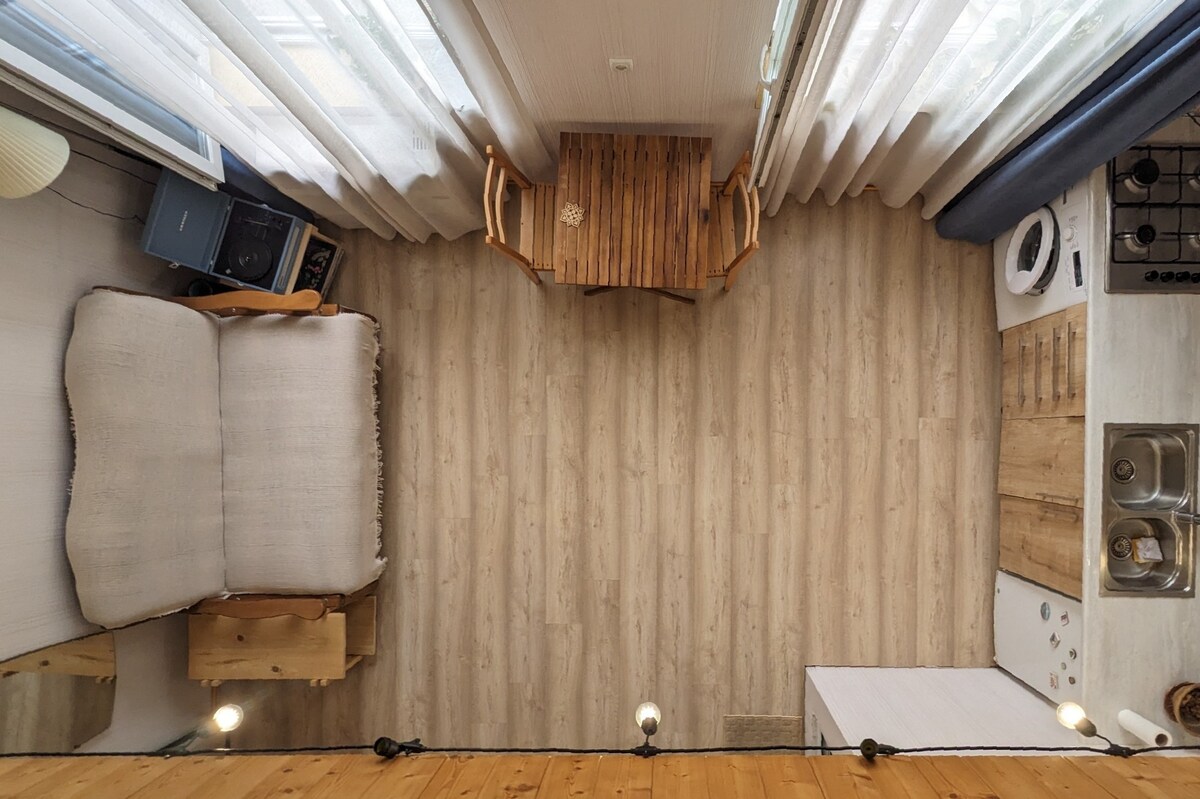 Tiflisin ən qaynar yerində, 5 ulduzlu otellərlə əhatə olunmuş qonaqlamanızdan zövq alın: Biltmore, Radisson, Stamba və Rooms və Rustaveli metro stansiyasından və bütün əsas görməli yerlərdən cəmi bir neçə addımlıq məsafədə. 1930-cu illərdə daşdan inşa edilmiş binanın ən üst mərtəbəsində yerləşən, özəl terrası və gözəl mənzərəsi olan vintaj loftda qonaqlayacaqsınız. Yerdən tavana qədər olan pəncərələr hər otaqdan bol günəş işığı, təbii işıq və gözəl mənzərələr təmin edir, lakin gündüz yuxusu gələnlər üçün ağır pərdələr də var:)