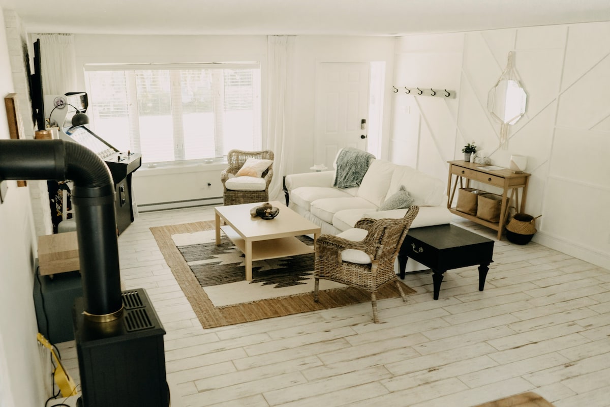 Come visit the beautiful historic town of Bayfield and stay in our very chic family friendly cottage by the lake, affectionally known as the Sugar Shack. Just a one-min walk to the beach and a short stroll or bike ride to the village square where you can enjoy local shops and restaurants. Cozy up and enjoy family time with some arcade games & vinyl, BBQ on the patio, relax in the plug and play hot tub, watch the kids play on the playset or light the campfire and enjoy the starry nights.