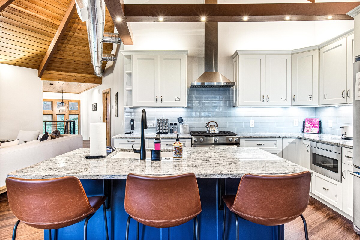Huge fire pit with charcoal grill. Two connecting back decks with a gas grill and hot tub. Wood burning fireplace with plenty of firewood. Granite and marble countertops. Full bath and powder bathroom. Leather furniture and fully equipped kitchen to Hunker Inn! Super cute and modern home built in 2017 with a loft for games. King bed in primary, full in 2nd bedroom, chaise lounge in loft. The Best of Both Worlds with Long Range Tranquil Mountain Views, very close to the ski resort.