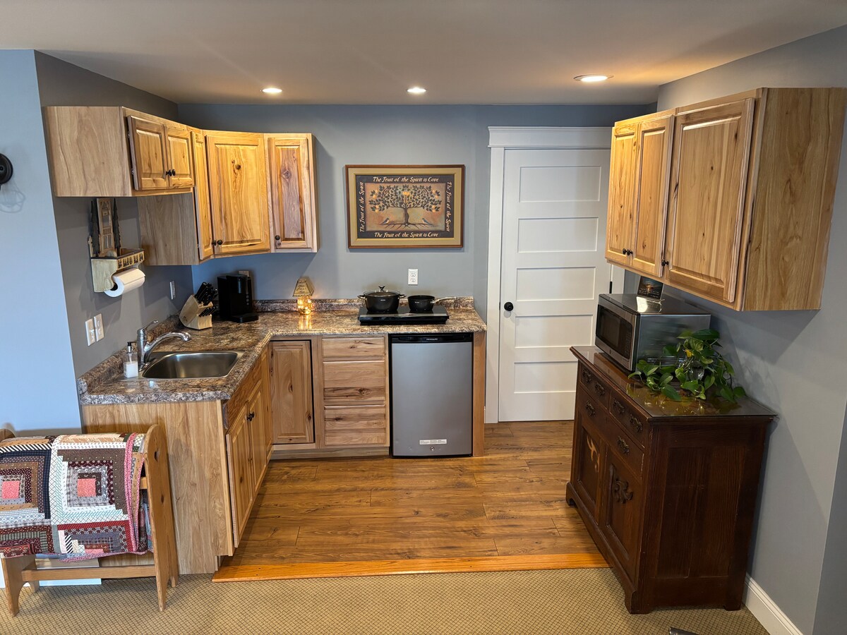 Private entrance & space. French doors large windows bright and airy. Lg living rm. Bed Rm w/queen. bed rm W/ king (two twins made up as king)all the time. Small kitchen w/micro coffee maker & fridge. NO STOVE only a single NuWave burner. Come & go as you please. This apartment is the lower level of our entire home. Very private and separate space. Enjoy 25 Acres of wooded land. Only 2 miles to town. Age 21 or older to book. We do not take children under 12 No parties NoPets No smoking.