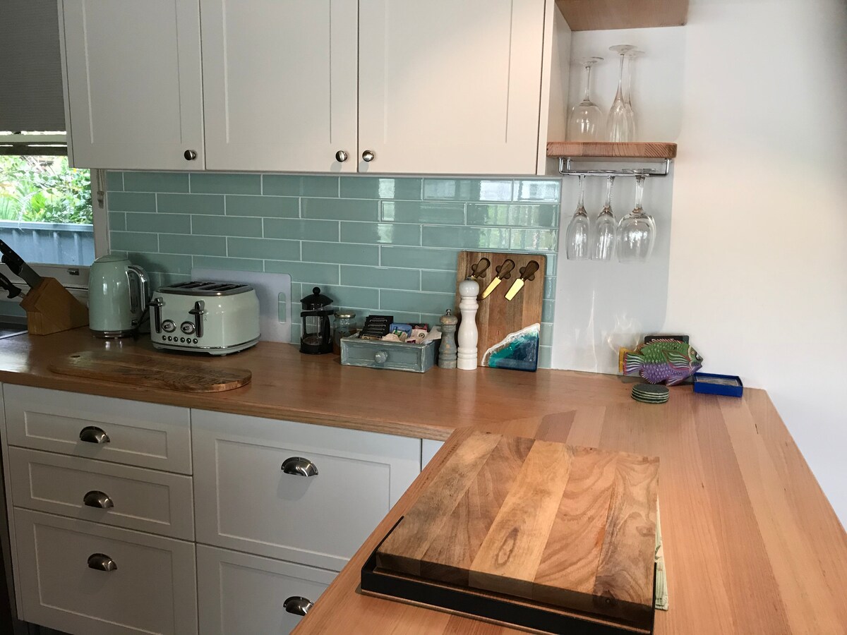 Luxury studio in a tropical garden,30 metres to beach front, designer bathroom with bath and rain shower, washing machine. A fully equipped kitchen, 1 queen size bed, fan, underfloor heating, outdoor deck with sea views and under cover private gazebo with lounge seating and electric barbecue /grill ,and all weather blinds. Your well behaved dog is welcome with its own bed and leashed between house and dog friendly beach at end of the garden..we are surrounded with wildlife that is protected .