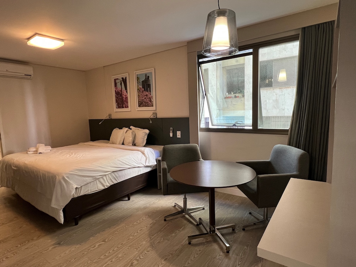 Bu mənzil yeni təmir olunub, müasir, gözəl və rahatdır. Nömrədə 42 düymlük ağıllı televizor, ikinəfərlik çarpayı, sürüşkən kondisioner və qarderob var. Qonaq otağında tv, Wi-Fi l, divan çarpayı və müxtəlif qab-qacaq, aşpaz, mikrodalğalı soba və minibarla təchiz edilmiş Amerika mətbəxi ilə iş və yemək üçün qranit masa var. Mənzil Pátio Savassi və Serra do Curral Ticarət Mərkəzinə baxır. Bura Savassinin mərkəzində yerləşir, burada yaxşı restoranlar, aptek və nəqliyyat var.