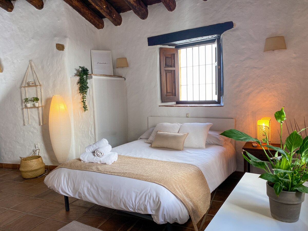 SAKİTLİK, SAKİTLİK VƏ TƏBİƏT Rahat kiçik daş, əhəng və taxta ev. Keçmişdən xilas olun ki, ondan zövq ala və bir neçə gün dinclik və sakitliklə keçirə biləsiniz. İki nəfərlik məkanı olan bu otaqda buxarı, yemək otağı və birinci mərtəbədə tam təchiz olunmuş mətbəxi olan qonaq otağı var. Gözəl çardaqda yerləşən otaq və hamam otağı Valle del Genalın inanılmaz mənzərələrindən zövq ala biləcəyiniz terrasa gətirib çıxarır.