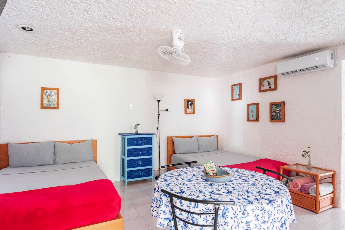 Kankunun ən yaxşı 2 çimərliyindən 5 dəqiqəlik məsafədə, Otel Zonasında yerləşən ayrıca studiya otağı. Şənlik/klublar bölgəsinə 2 dəqiqəlik avtobus səyahəti. Uzaqdan işləyənlər üçün əla internet sürəti! Otaq əsas evlə eyni qapıdadır, lakin çöldən öz girişiniz və müstəqil otağınız var. Otaqda 2 fərdi çarpayı, tam vanna otağı və dolab var. Tavanda ventilyator və kondisioner. Mini bar və mikrodalğalı soba. (Bu otağa daxil olmaq üçün pilləkəndən istifadə edilməlidir). Siqaret çəkənlər üçün kiçik balkon sahəsi.