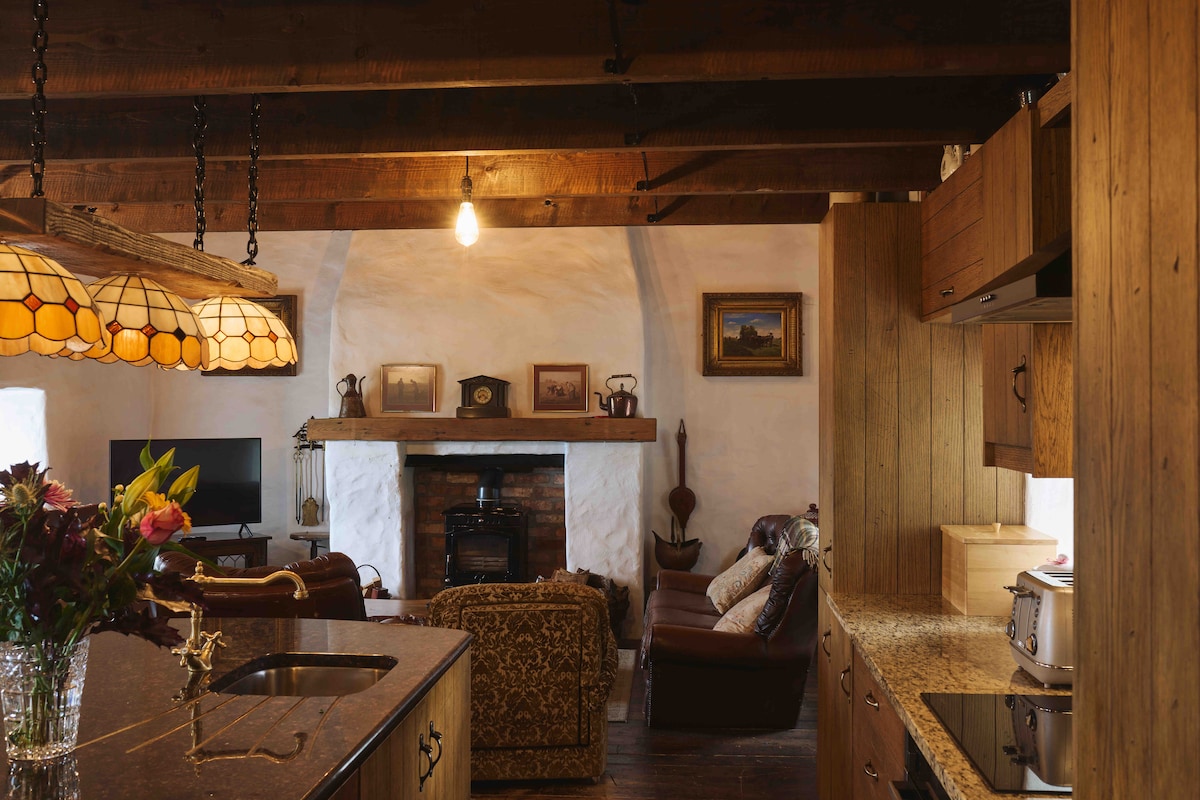 Set on an exclusive riverside estate renowned for wedding photoshoots, this luxurious stone cottage adjoins a Grade B1 listed country house. Expertly restored, it showcases original stone walls and a striking internal chimney, paired with elegant wood panelling. Full-height windows flood the space with light, adding a refined modern touch. Includes a bespoke kitchen with vintage fridge, open shelving, and two beautifully styled bedrooms.