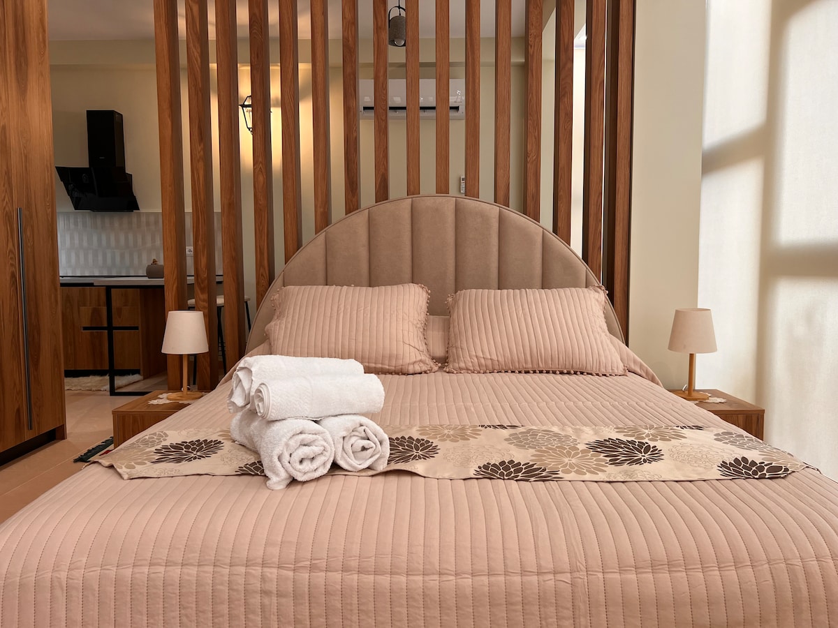 Bir Yataq Otaqlı Mənzil və Eyvanlı bir qonaq otağı – 4 Qonaq üçün Uyğundur Bu müasir bir yataq otaqlı mənzil 4 nəfərə qədər qonaq üçün rahatlıq və funksionallıq təklif edir. Burada çarpayı olan rahat yataq otağı, açılan divan-çarpayı olan işıqlı qonaq otağı, yemək sahəsi olan tam təchiz olunmuş mətbəx və duşu olan ayrıca hamam otağı var. Eyvan istirahət və ya yemək yemək üçün mükəmməl olan xoş açıq hava məkanı təmin edir. Rahat qonaqlama axtaran ailələr, cütlüklər və ya kiçik qruplar üçün idealdır.