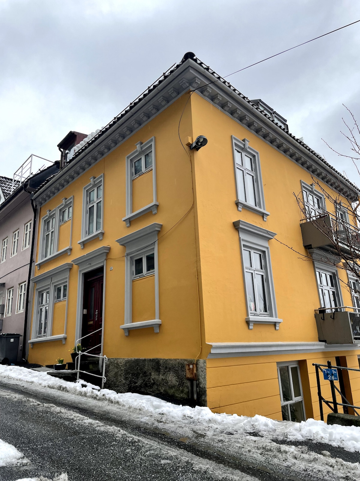 Welcome to the historic Bergen house, dating back to around 1780, located in the charming Sandviken area just a stone's throw from the bustling city center among local residents. You'll have the entire house to yourself, complete with a cozy outdoor terrace. The property is secluded from street noise, tucked away in a small alley. Its convenient location offers easy access to supermarkets, a bus stop, hiking trails, and city bike parking. Additionally, you can find paid street parking nearby.