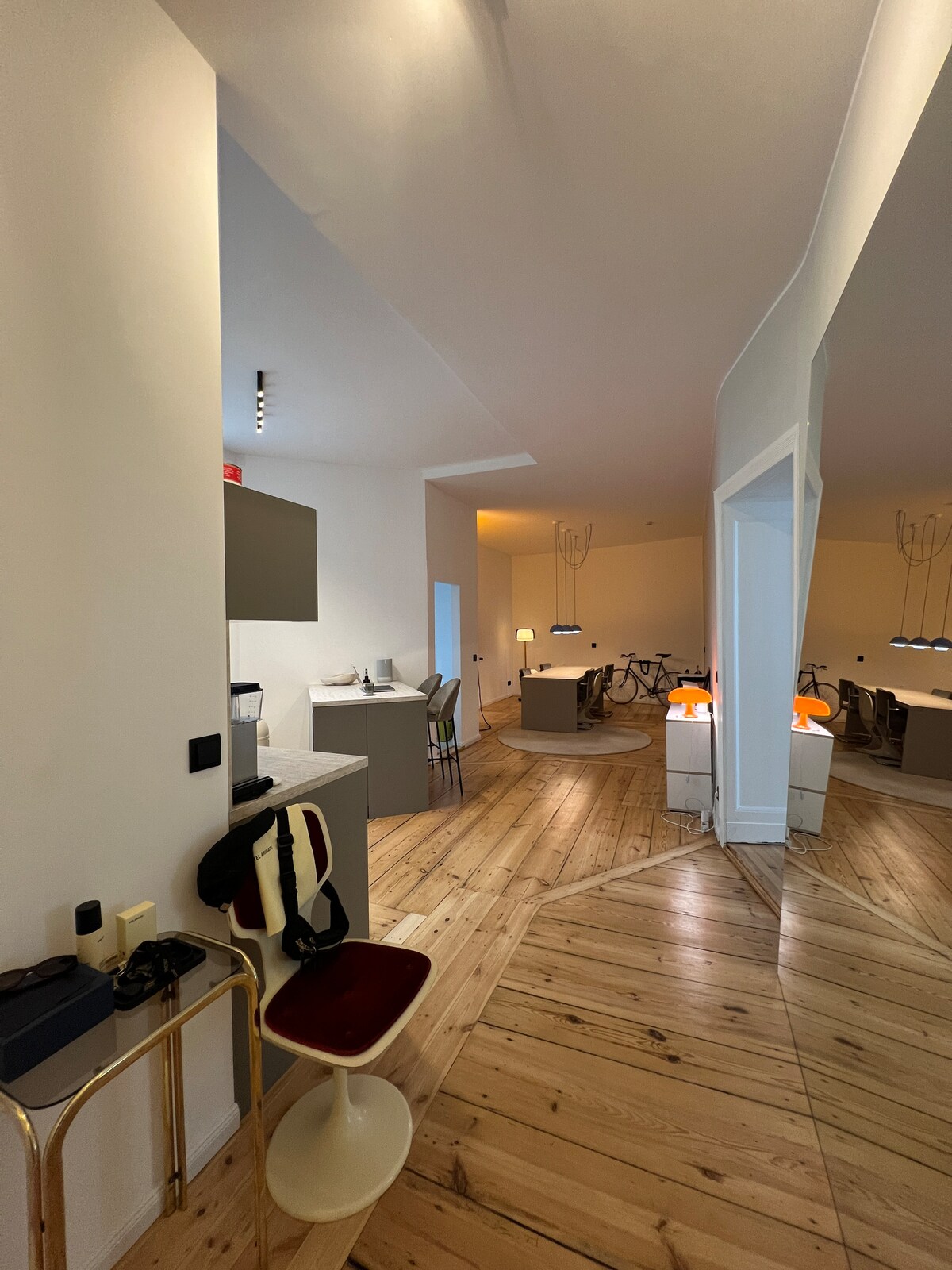 Başlanğıcda salon/ iclas otağı kimi dizayn edilib və planlaşdırılıb. İdeya müzakirə etmək, görüşmək və təmsil etmək üçün yer tikmək idi. Bu sürətlə inkişaf edən Berlin Şəhərində hər şeyə çatmaq üçün əla olan mövqenin səbəbi. Məkan və atmosferdə xoşbəxt sinxronizasiya və özü üçün iş / həyat balansı var. Buranı çox sevirəm - adətən mənim ofisimdir . Amazon Prime ilə 2 böyük düz ekranlı televizor ekranımız var, Netflix Spotify ilə səs sistemi və sakitləşmək üçün açıq yanğın yeri.