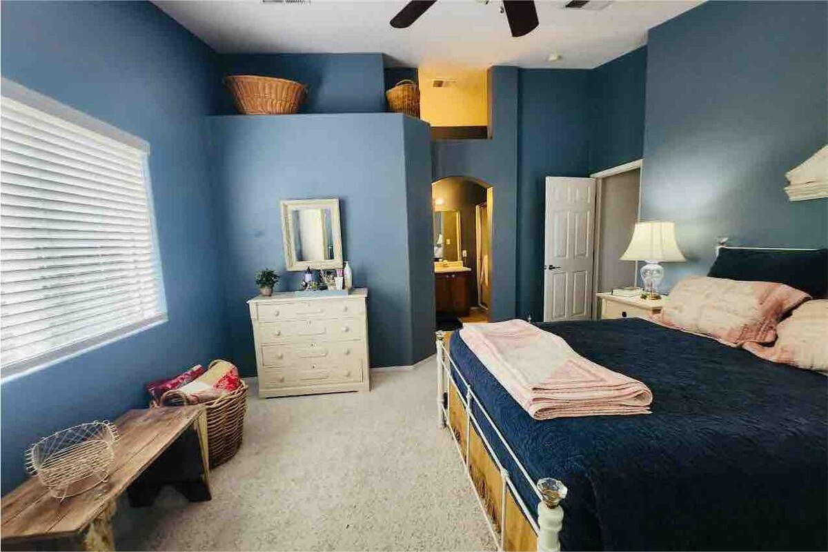 Enjoy a stylish experience. Two-room suite with a bedroom, sitting room, and a full private bath. Accommodates up to 4 adults. There is a private entrance to the suite. King bed, walk-in closet, and a dresser, side tables, ceiling fan w/ light, and a air filtration system. Sitting room has a queen Murphy bed, coffee and wine bar with microwave, mini refrigerator, coffee maker (coffee and tea supplied), and dishes, utensils. Bathroom is Jack and Jill style w/ 2 vanities and standing shower.