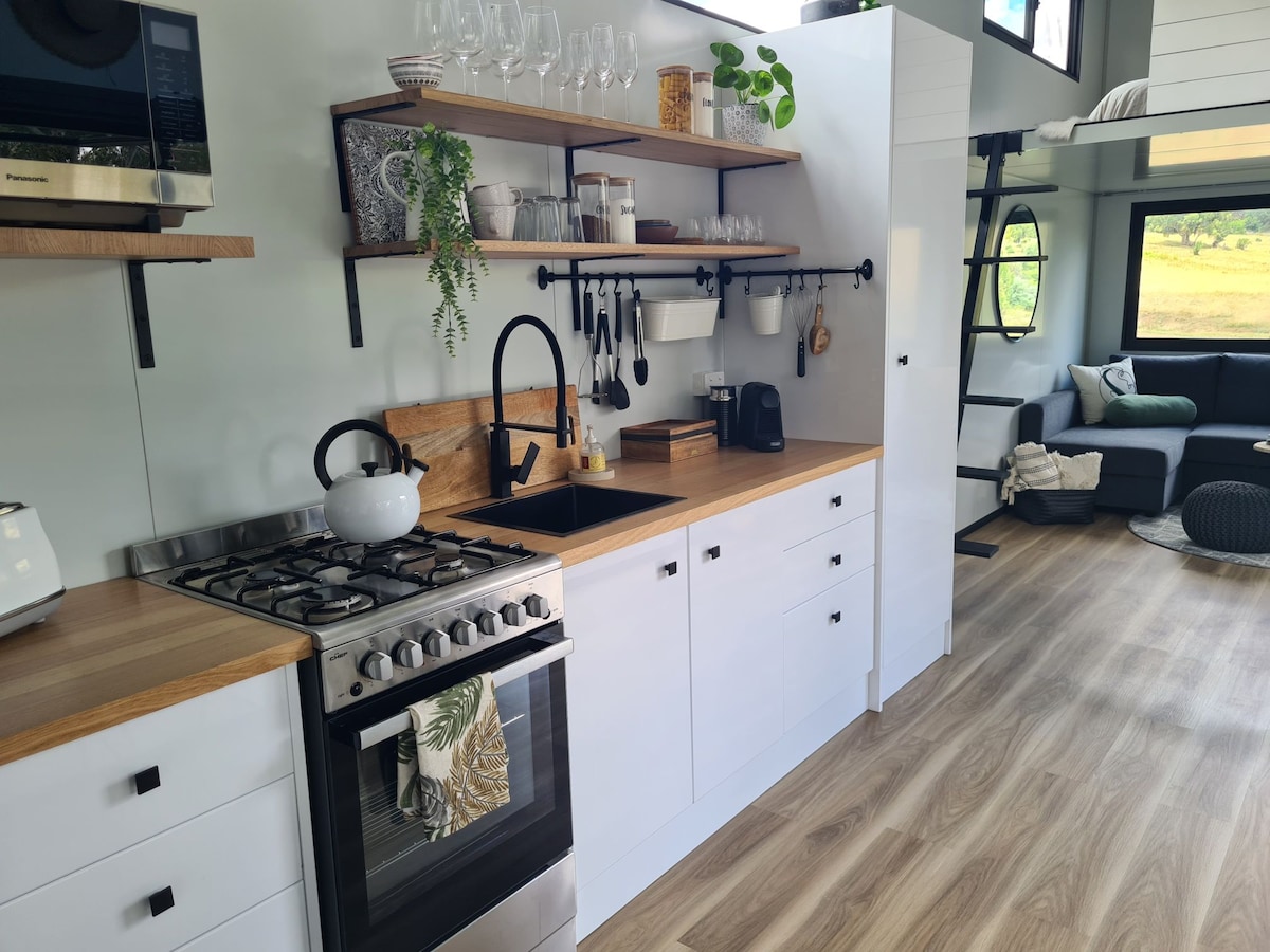 Tuckerbox Tiny is located in Gundagai only a few minutes drive from Hume Freeway. It is perfect for a romantic/family getaway or as a quiet and peaceful break on your road trip. Ideally located just out of town, Tuckerbox Tiny is surrounded hills, overlooks Morley’s Creek and picturesque farmland. It feels like a private country retreat but is only 2km to the Main Street, where you can enjoy breakfast at fantastic cafe’s, bakery, museums, antique shops, Carberry Park, supermarket, etc