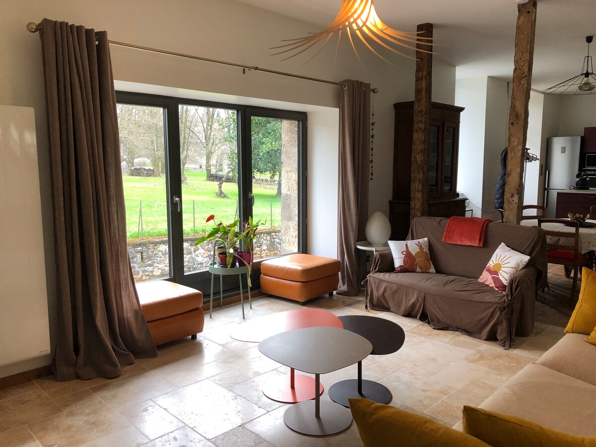 Jolie maison au coeur de la Corrèze totalement clôturée avec grand parc de 2000 M2 ,facile d'accès par une sortie d'autoroute A20. La maison est très bien équipée : grand salon avec TV , espace jeux pour enfants, espace lecture. Cuisine tout équipée. Cellier avec congélateur, lave linge, chaise haute , poussette. Grande chambre avec dressing, lit parapluie. Salle de bain douche a l'italienne, double vasque sèche cheveux et nombreux rangements. Les draps et serviettes sont fournis .