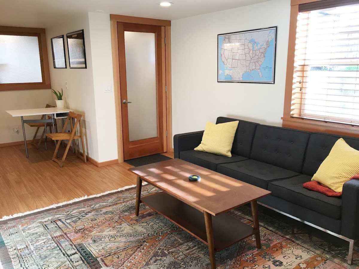 Qəhvə dükanlarına, ərzaq dükanlarına, restoranlara və parklara qısa məsafədə təhlükəsiz, sakit yer. Əla məhəllə! Çiçəklər və vegilərlə əhatə olunmuş şəxsi açıq verandanız olan yeni, müasir mənzil. Yastıq üstü döşək və müasir hamam otağı olan böyük ölçülü çarpayıda yaxşıca yatın. Sürətli Wi-Fi + öz paltaryuyan/qurudan maşınınız. Verandada vikinq qaz sobası, qabyuyan maşın, manqal ilə bişirin. Sietlın ən yaxşı yeni restoranları buradadır, üstəlik pivə zavodu, pablar və daha çoxu. Biz it dostuyuq!