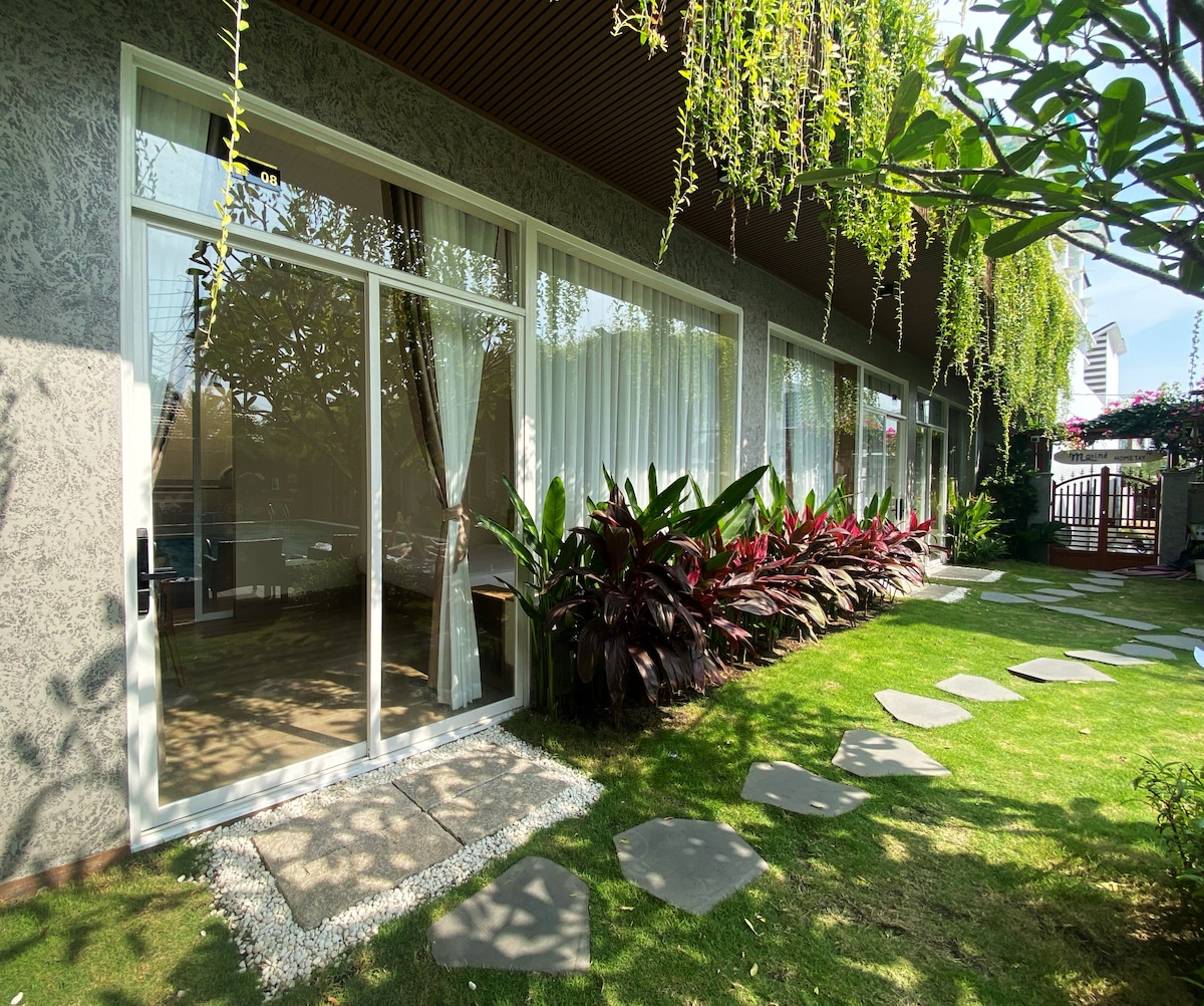 Room 5-Suite King Bed w Pool & Garden View là căn phòng rộng nhất và sở hữu vị trí đắc địa nhất. Vị trí góc với 2 khung cửa kính lớn, mở ra tầm nhìn kép tuyệt đẹp vừa hướng vườn, vừa hướng hồ bơi. Với diện tích 26m² rộng nhất, căn phòng là tuyên ngôn của sự độc lập, yên tĩnh nhưng sở hữu tầm nhìn rộng mở, phóng khoáng. Phòng sở hữu 3 hướng view khác nhau gồm: view hồ bơi, view sân vườn sau và view góc rộng có thể nhìn toàn cảnh tòa nhà Mariné Homestay.