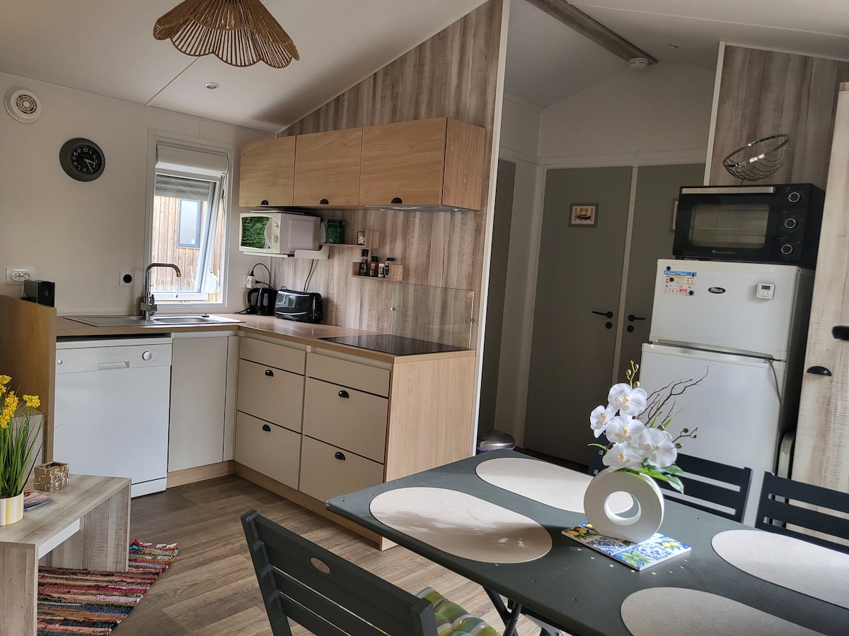 Charmant bungalow tout confort 4 personnes situé dans un camping 4* 1 chambre pour 2 personnes avec 1 lit en 140 et penderie 1 chambre pour 2 personnes avec 2 lits en 80 et penderie - Lave vaisselle - Lave linge - Cafetière à dosettes - Bouilloire - Grille pain - Presse agrumes - télévision - Terrasses aménagées - Place de parking privée - Wifi - Climatisation Emplacement idéal Accès aux infrastructures du camping.