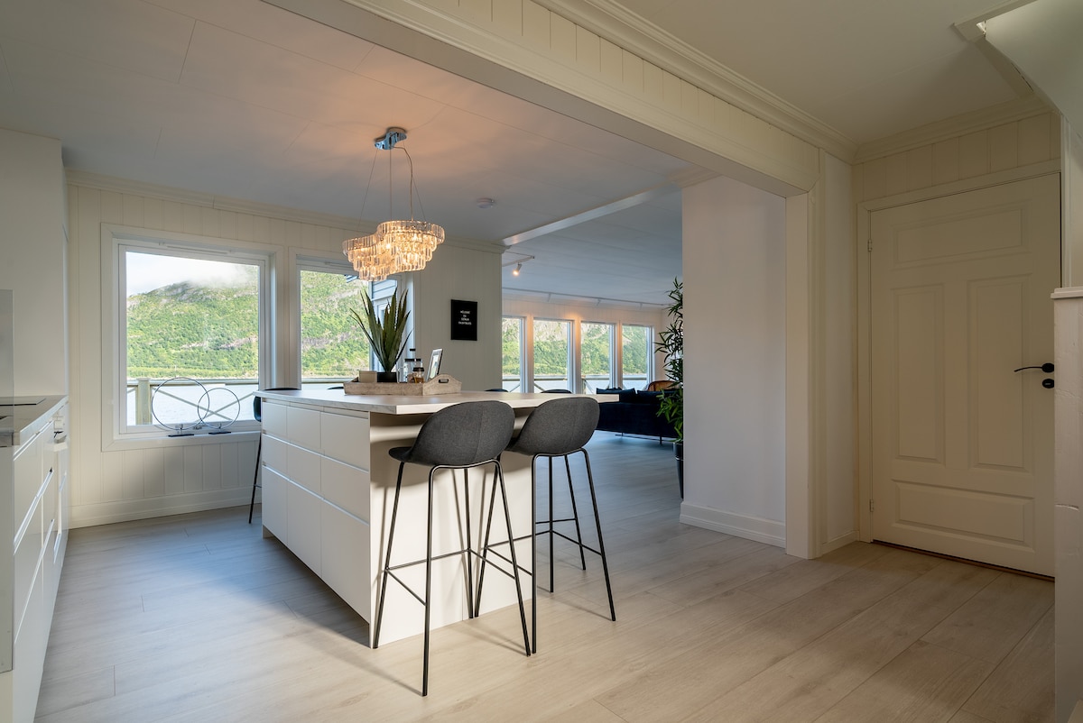 Let your Senja fairytale begin in our peaceful, newly renovated house by the sea. Enjoy panoramic fjord and mountain views from the spacious living room or large balcony. Well-equipped kitchen, comfy beds, laundry room. Watch the midnight sun in summer and the northern lights in winter – all from the comfort of your living room. Just 500 m to restaurant and shop. Fjordgård is home to the famous Segla mountain.
