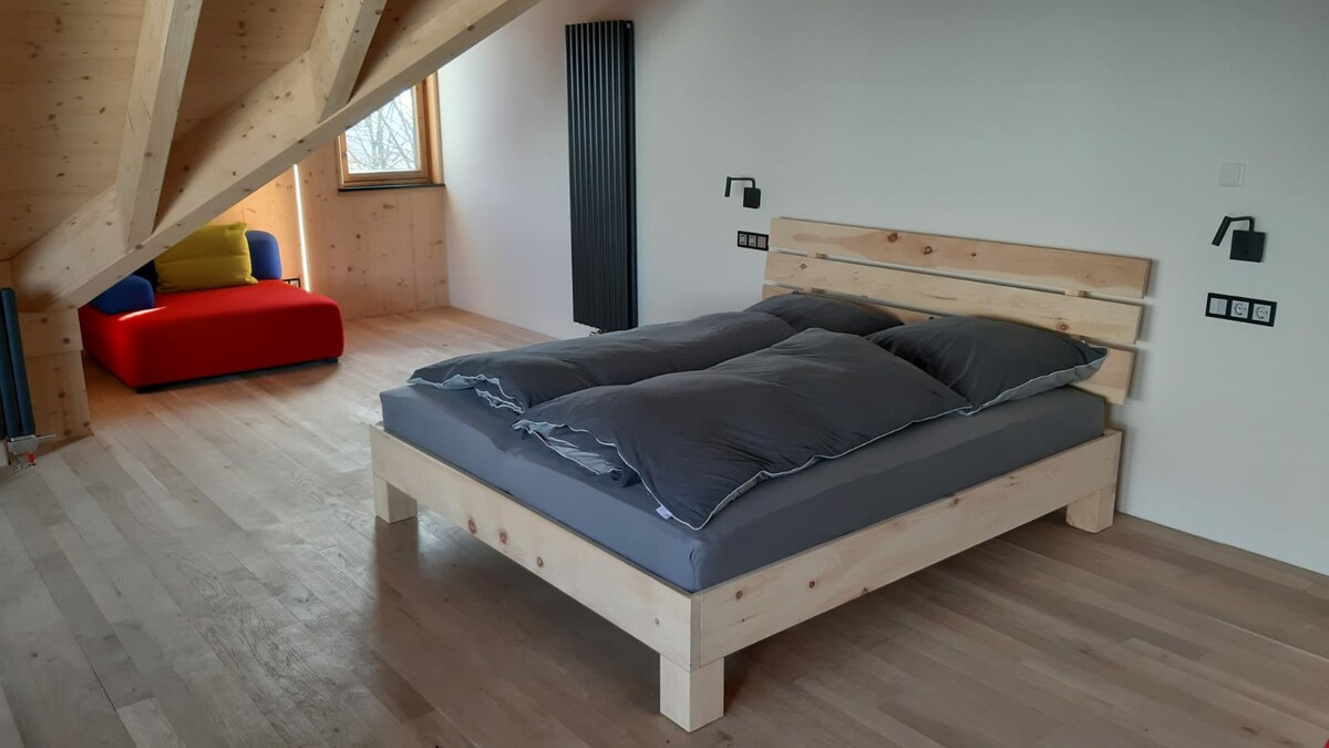 Müasir yeni tikilidə 2.5 otaqlı sakit mənzil: - Əlçatan / 56m². - Yataq otağı, hamam otağı və tam təchiz olunmuş balaca mətbəxi olan qonaq otağı (daxil olmaqla) İnduksiya peçi, qabyuyan maşın, soba və qəhvə maşını). Qazlı manqal ilə -biq terrası - Düz ekran (kabel televiziyası və filmlərlə DVD kolleksiyası). - Playstation 4 Pro (oyunlar pulsuz icarəyə verilə bilər). - Mənzil ekoloji cəhətdən çox davamlıdır (orqanik enerji isitmə və enerjiyə qənaət edən ev) - Giriş. "Echt Bodensee kartı" qonaq kartı