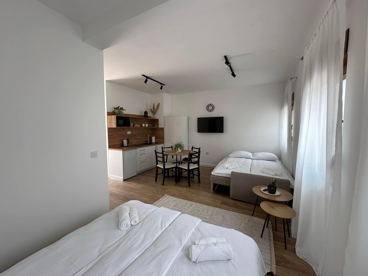 Yeni binada yerləşən bu mərkəzdə yerləşən yerdə dəbli təcrübədən zövq alın. Mənzil komfortlu çarpayı, 4 nəfərlik yemək masası və müasir tam təchiz olunmuş mətbəxli işıqlı yataq otağından ibarətdir. Smart TV ilə günəşli qonaq otağı. Qonaq otağındakı açılan künc daha 2 qonaq üçün əlavə çarpayı kimi də xidmət göstərə bilər. Bütün mənzil memar (Adil Qlavovik - oxarxiteti) tərəfindən dizayn edilib.