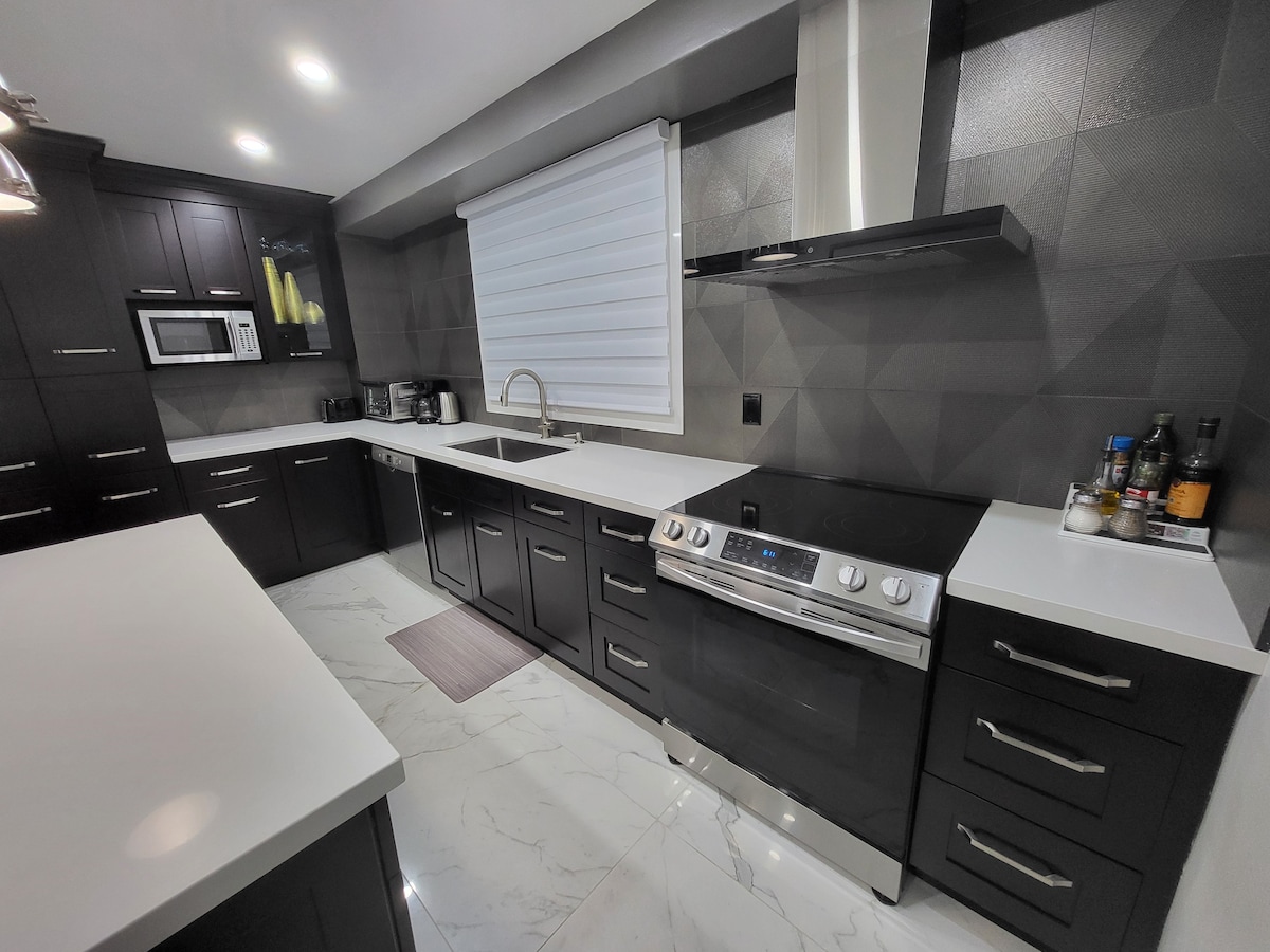 The stunning house in Etobicoke is only a few minutes from the Airport and City Centre. This spacious open concept, rare luxury modern home, is beautifully designed and decorated. It is a fully stocked home and will have everything you could ever wish for a short-term stay. Perfect for large families and groups! min age 25 yrs to book. Room 1 king bed Room 2 queen Room 3 twin and another twin roll out Room 4 queen no party policy or excessive noise. this is a quiet listing