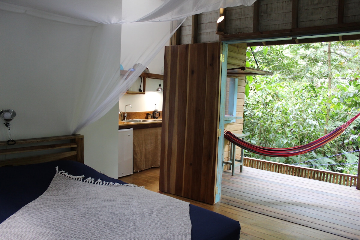 Bu müasir üslublu evcik gözəl bir cəngəllik mühitində yerləşir. Tağlı çardaq mənzərəli və yataq zonamızda dəbdəbəli kral ölçülü çarpayı, divan və ya iki nəfərlik çarpayılarınızın rahatlığında meymunlar və quşların dadını çıxarın.Kondisionerlə soyudulmuş qapalı məkanımızda istilikdən və həşəratlardan uzaqlaşın. Demək olar ki, istənilən yeməyi hazırlamaq üçün cihazları olan ekranlı mətbəx.Təbiətdən həqiqətən zövq almaq üçün açıq havada xüsusi duşu olan əla hamam otağı. Yağışlı günlərdə sizi məşğul etmək üçün oyunlarımız, kitablarımız və ağıllı televizorumuz var. Nuş olsun!