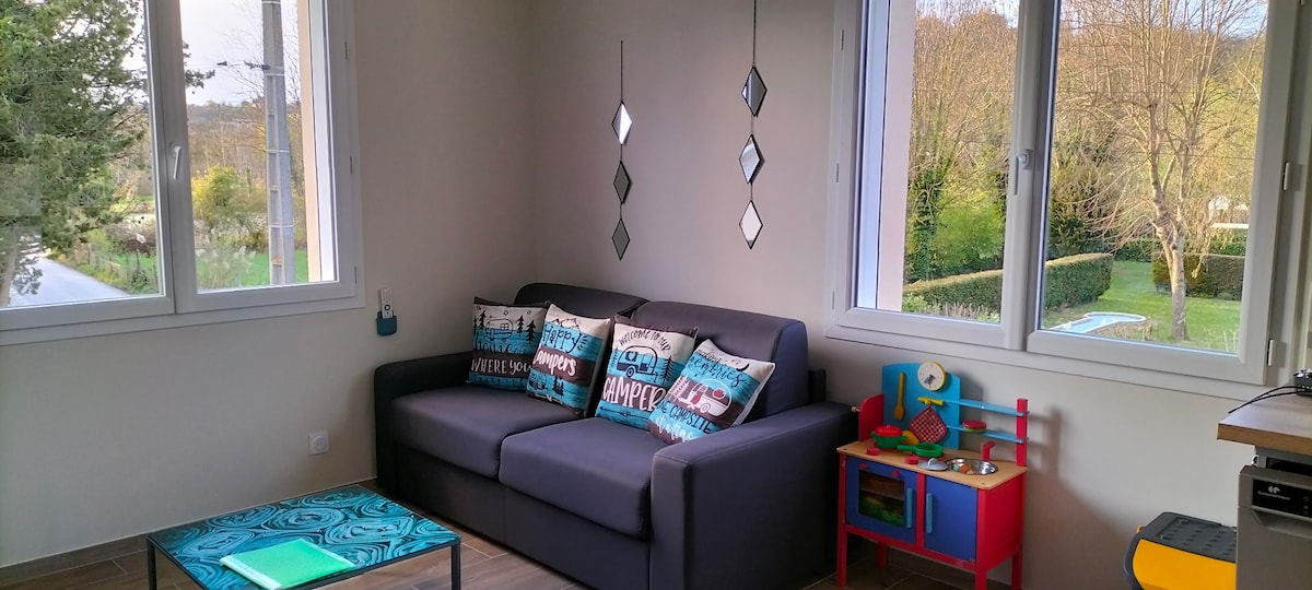 Sizi təbiətin ortasında, meşədə, at parkları və digər dörd və ya iki ayaqlı dostlarımın arasında yerləşən "Les abeilles des loves de Brian" kottecimdə qarşılamaqdan məmnun olacağam. 4 nəfərlik bu qonaqlama yerində bir neçə otaq, qonaq otağına açıq yemək otağı/mətbəx, iki yataq otağı (190x140 və 200x160-da 1 çarpayı, yataq örtüyü təmin edilir), hamam otağı, ayrıca tualet, 30m² sahəsi olan ayrıca terras, eləcə də internet bağlantısı var.