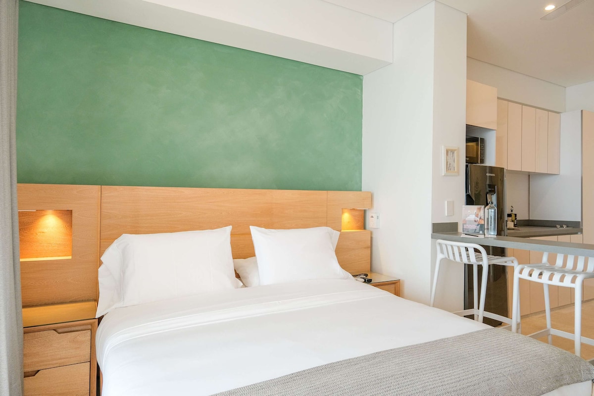 Brand-new 25 sqm exterior-facing design studio located in a luxury hotel-style tower on one of the best blocks in Bocagrande. Thoughtfully designed with premium finishes, modern kitchenette, air conditioning, and fast Wi-Fi. The studio offers exterior views and a bright, comfortable layout. The well-known Spinning Center Gym Cartagena is located within the same tower—ideal for short or extended stays.