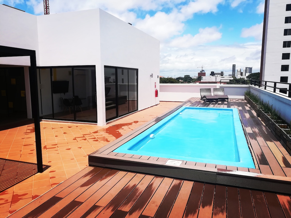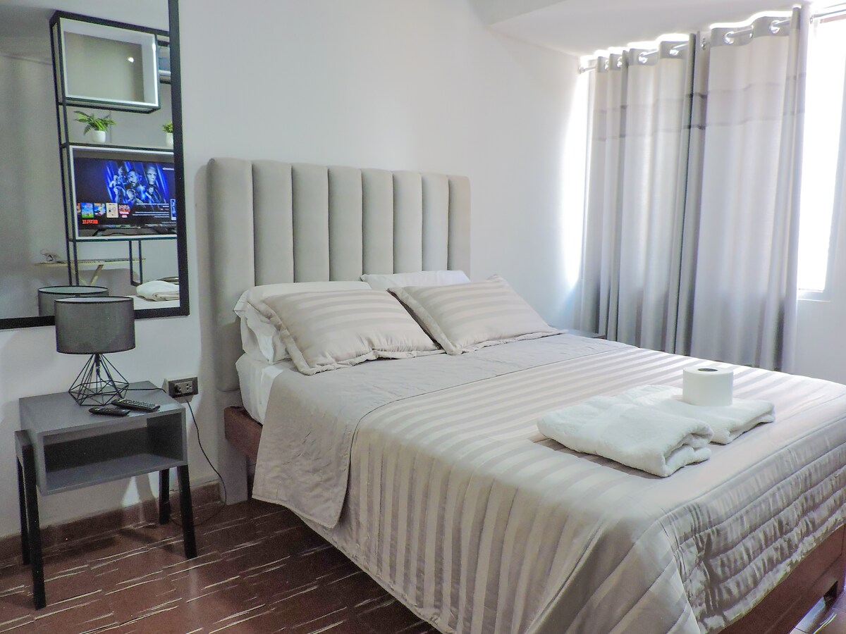Ölkənin ən yaxşı sosial sahələri olan Equipetrol ⭐️ eksklüziv, dəbdəbəli, müasir,TƏHLÜKƏSİZ, zərif bütün Santa Kruzda ən yaxşı yerə gəlin. Banklarınız, aptekləriniz, restoranlarınız var,hamısı çox uzaqdadır. Los Tacibos otelinin qarşısındakı Avenida Equipetrol 3 halqasının ortasındakı Sky elitasında tətil, biznes və ya iş qonaqlamanızdan maksimum yararlanın. Çox yüksək sürətli 300 Mbit/s Wi-Fi və TV kabeli🌎.